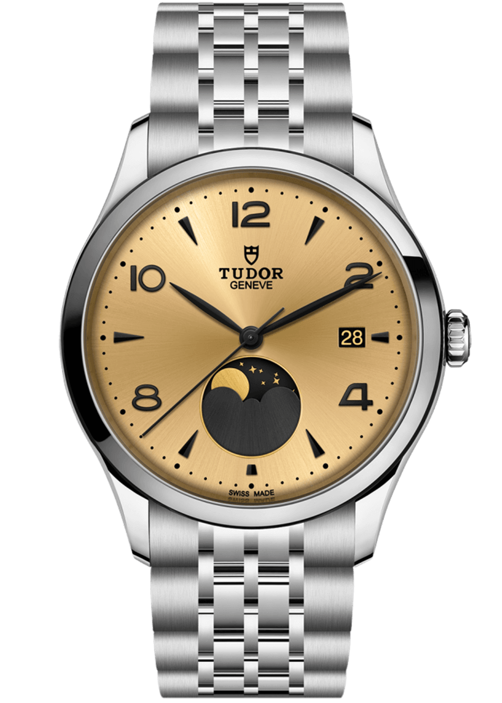 The TUDOR 1926 Luna features black, blue or champagne-colour sun-brushed dials, domed for a vintage touch, and a TUDOR metal seven-link bracelet. The wealth of detail on the dials of the 1926 line creates a striking and intricate play of light that perfectly complements the sword-shaped hands with their matching colours, and the moon phase indicator at 6 o’clock adds poetry to the watch.