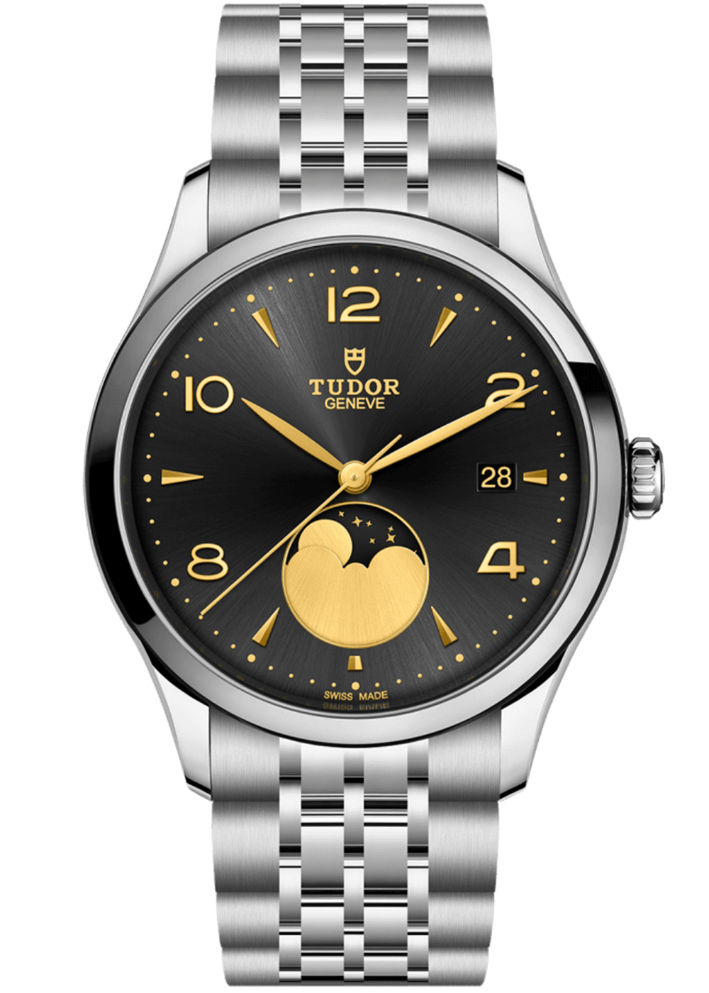 The TUDOR 1926 Luna features black, blue or champagne-colour sun-brushed dials, domed for a vintage touch, and a TUDOR metal seven-link bracelet. The wealth of detail on the dials of the 1926 line creates a striking and intricate play of light that perfectly complements the sword-shaped hands with their matching colours, and the moon phase indicator at 6 o’clock adds poetry to the watch.