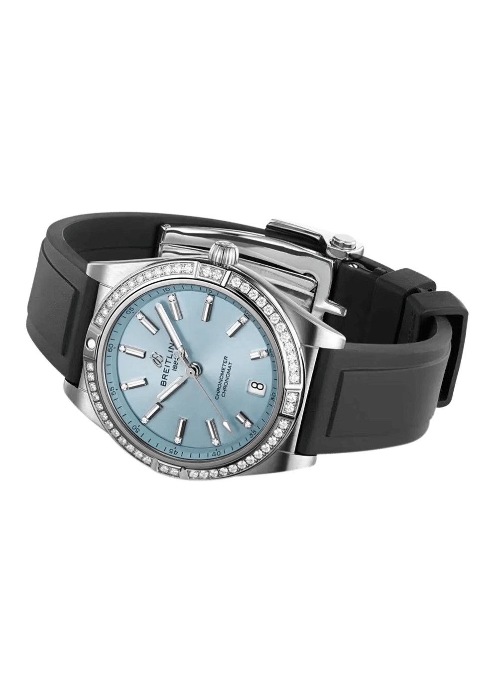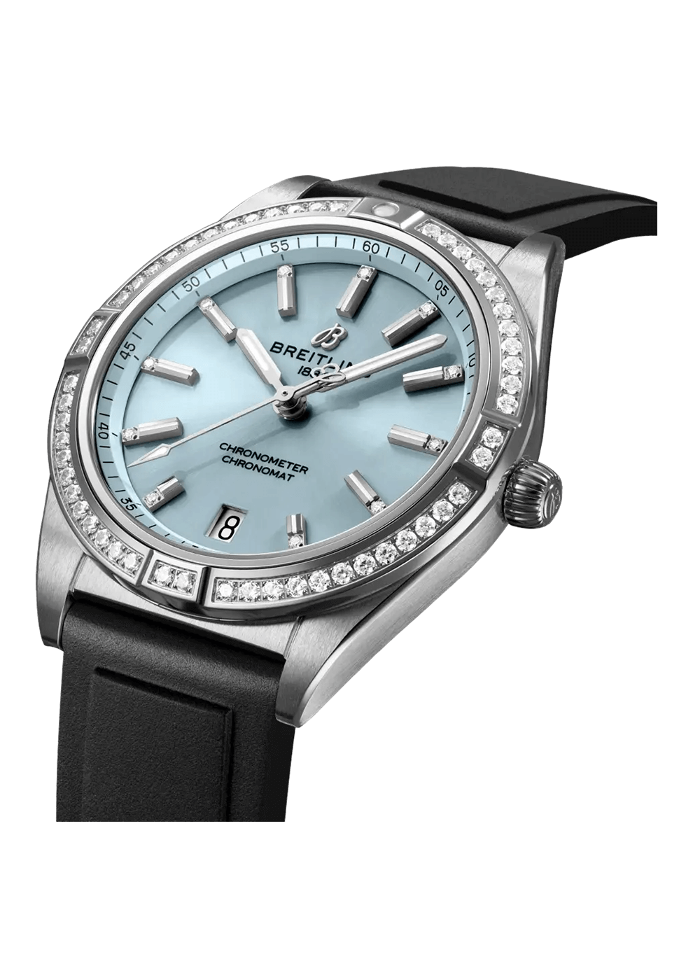 Diese spezielle Chronomat Automatic 36 verfügt über ein Edelstahlgehäuse mit einer edelsteinbesetzten Lünette aus 18 Karat Graugold, die mit einem eisblauen Zifferblatt kombiniert ist. Dieser Chronomat ist nur mit einem Kautschukarmband erhältlich und wird vom Breitling-Kaliber 10 angetrieben, einem COSC-zertifizierten Chronometer.