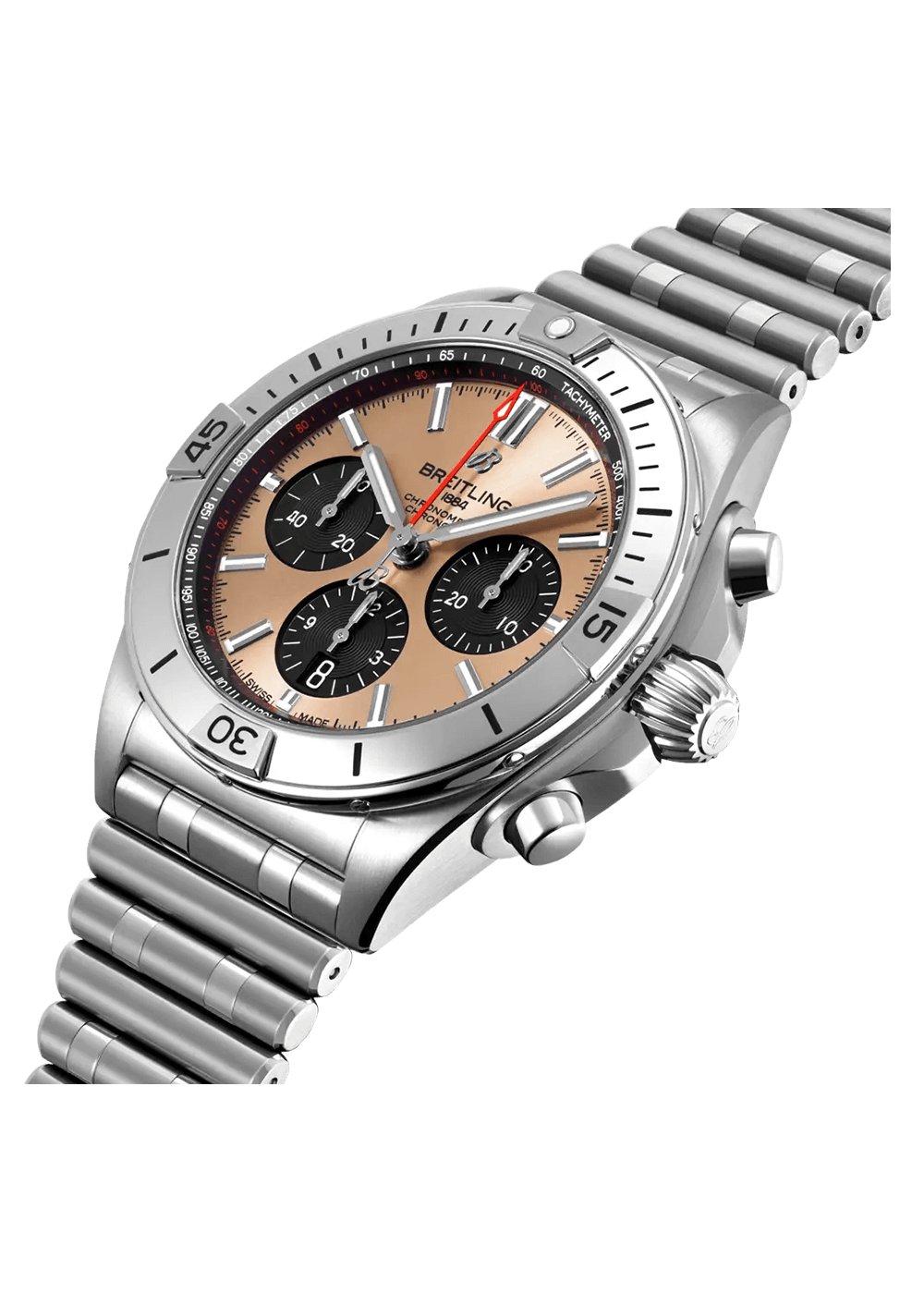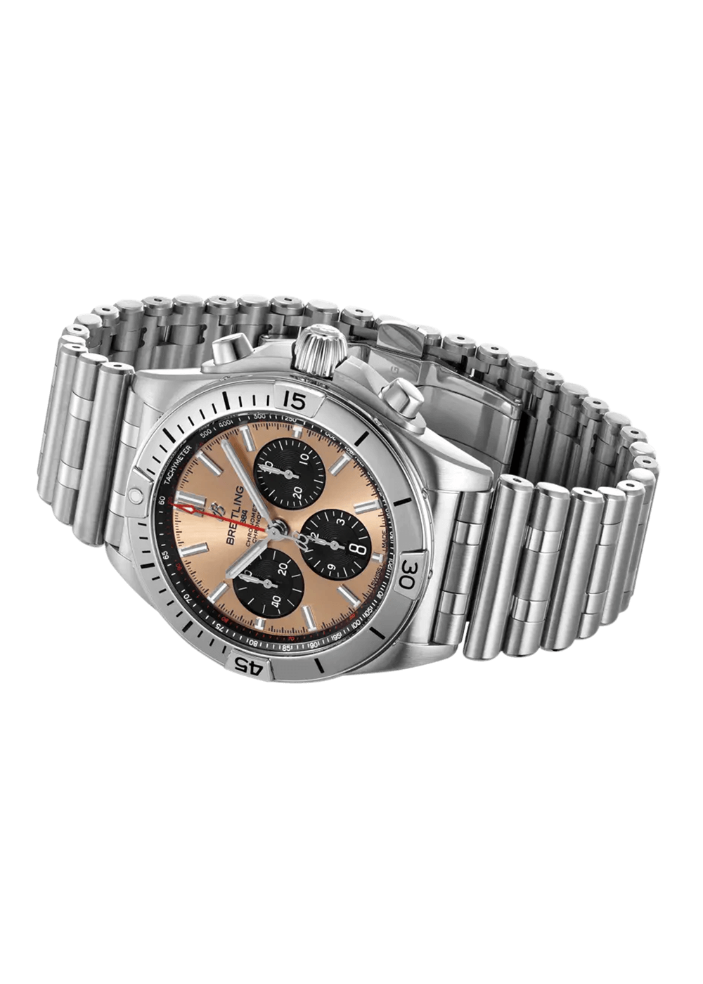Die Chronomat ist mit schwarzen, blauen, silbernen und kupfernen Zifferblättern erhältlich und auf das charakteristische Rouleaux-Armband abgestimmt.