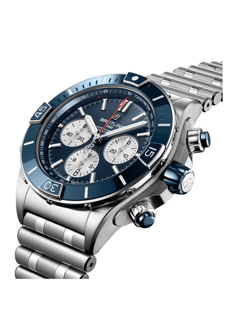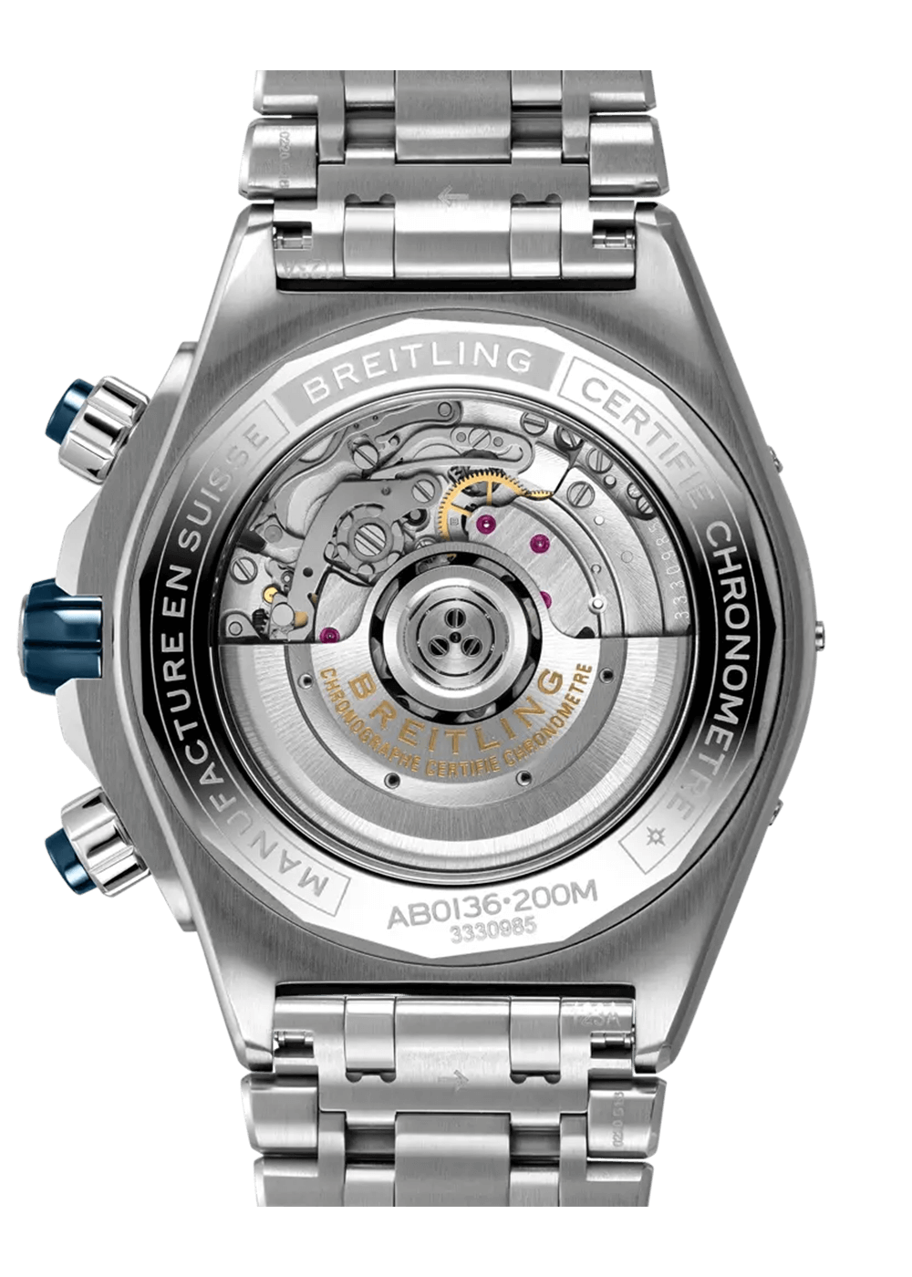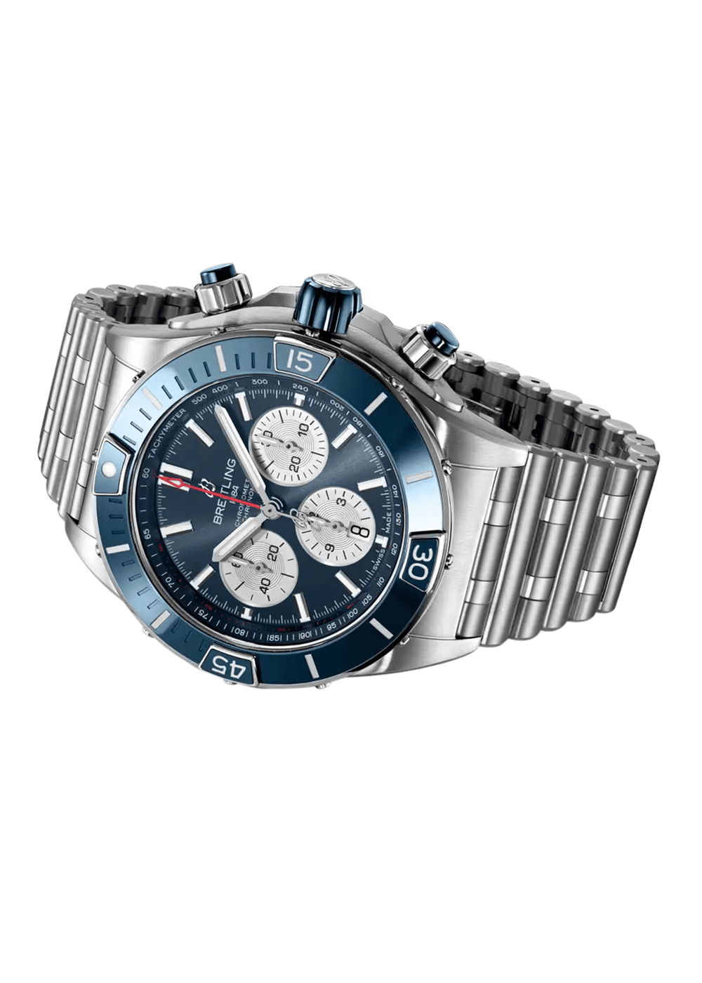 Angetrieben wird sie vom Breitling-Manufakturkaliber 01, welches eine Gangreserve von etwa 70 Stunden bietet. Die Super Chronomat ist bis 200 Meter wasserdicht.