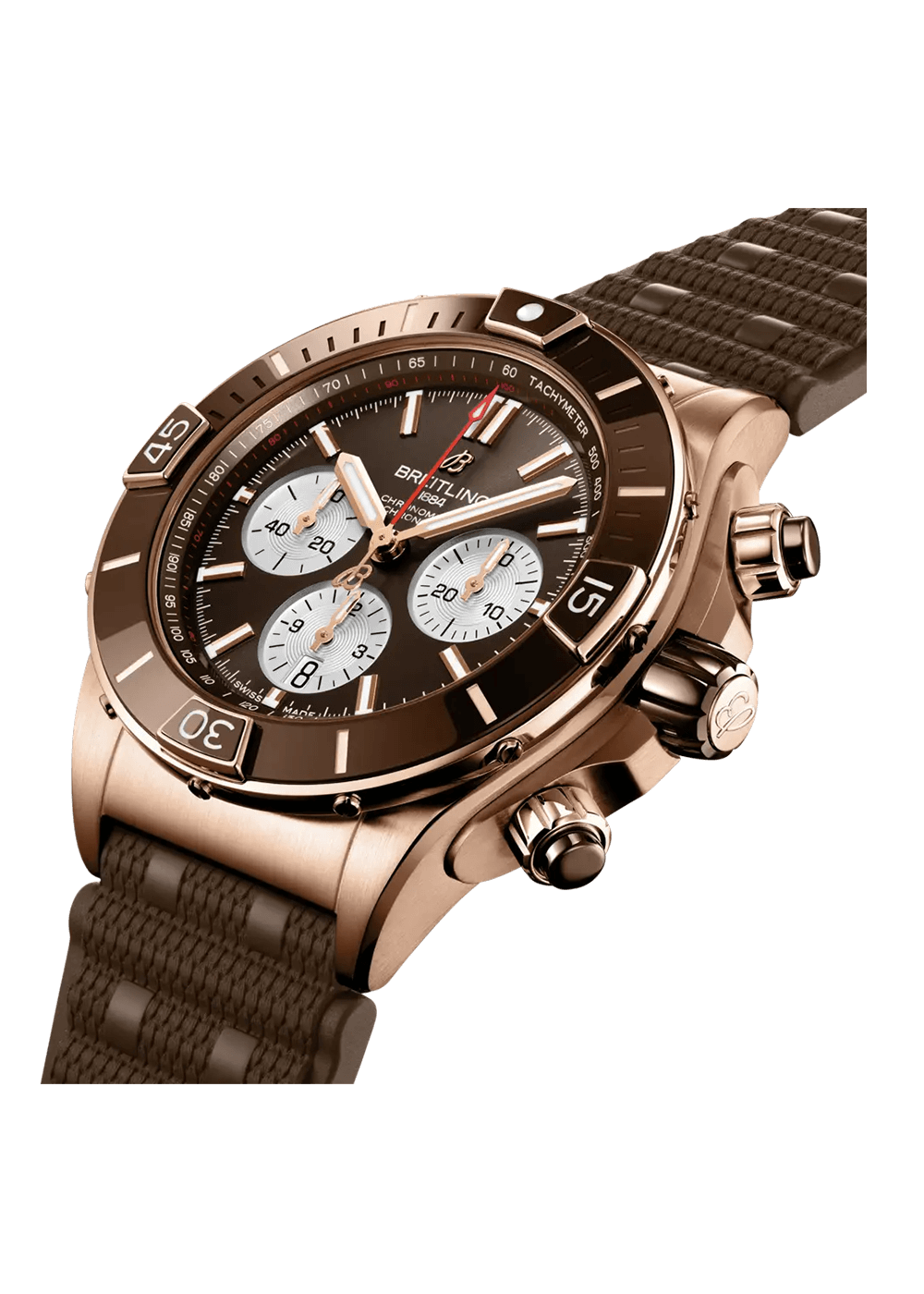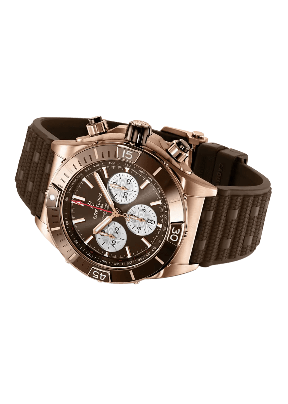 Mit einem 44-Millimeter-Gehäuse ist die Super Chronomat Kollektion die Markanteste ihrer Art. Wichtige neue Features sind die Lünette aus Rotgold mit Keramikeinsatz – ein Novum bei einer Chronomat – sowie die Wahl des Rouleaux inspirierten Kautschukarmband. Das neue Kautschukarmband wird in modernster Spritzgusstechnik hergestellt. Seine drei unterschiedlichen Texturen – matt, glatt und in gewobener Optik – verleihen ihm eine besondere Tiefe.