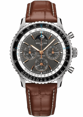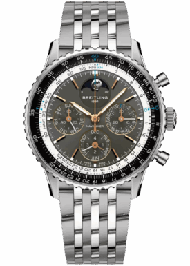 Ein abgeflachter Rechenschieber und ein gewölbtes Glas erzeugen den Eindruck eines kompakteren Profils. Polierte und gebürstete Finishes verleihen den Metallelementen ein hochwertiges, glänzendes, aber dennoch dezentes Aussehen. Getragen von Astronauten im Weltraum und von den grössten Stars der Welt, handelt es sich um den legendärsten Zeitmesser von Breitling und um eine der unverwechselbarsten Uhren aller Zeiten.