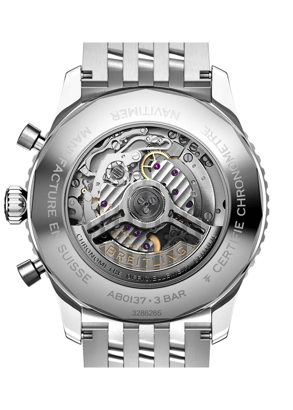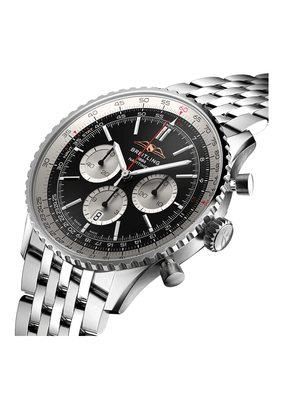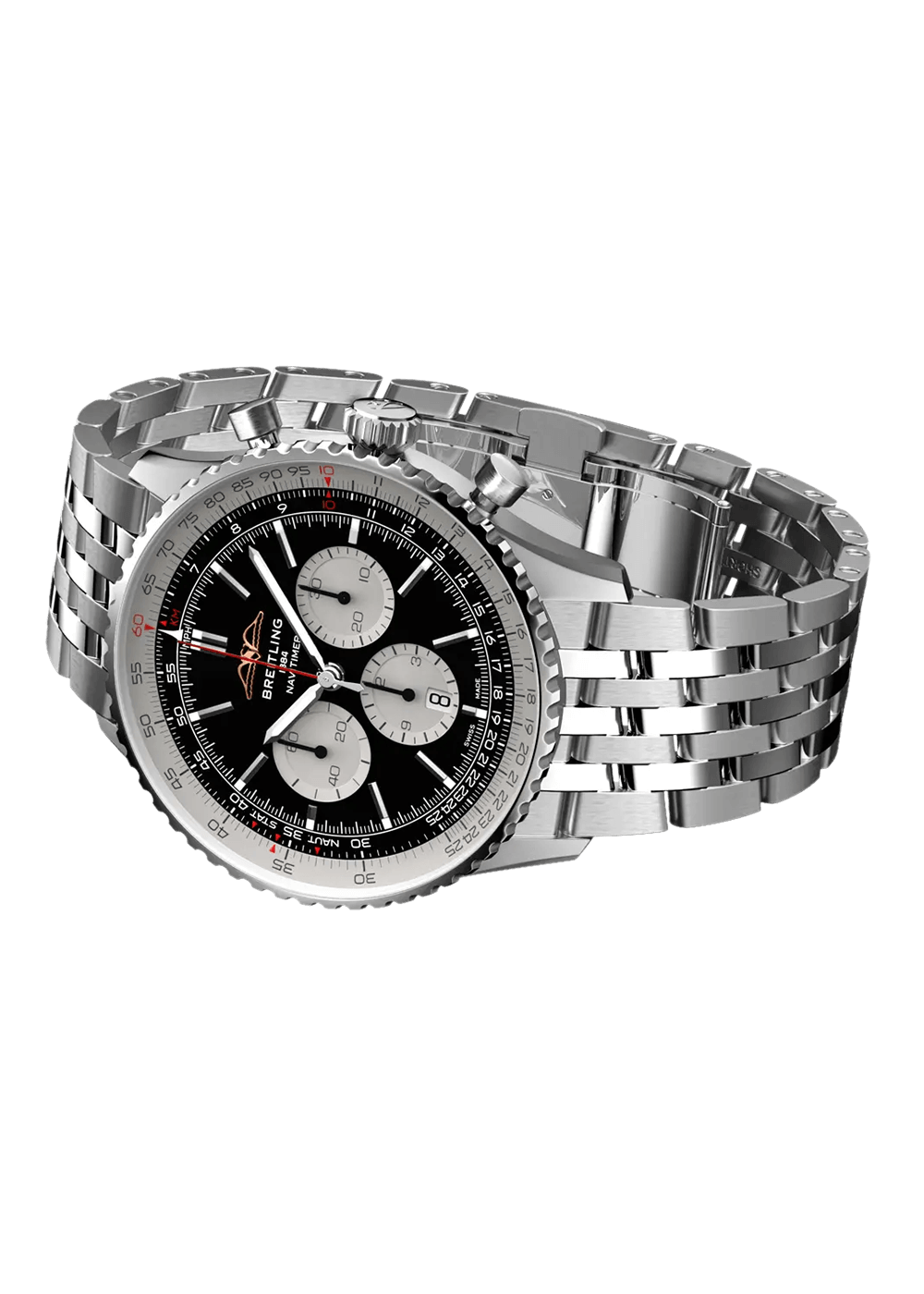 Ein abgeflachter Rechenschieber und ein gewölbtes Glas erzeugen den Eindruck eines kompakteren Profils. Polierte und gebürstete Finishes verleihen den Metallelementen ein hochwertiges, glänzendes, aber dennoch dezentes Aussehen. Getragen von Astronauten im Weltraum und von den grössten Stars der Welt, handelt es sich um den legendärsten Zeitmesser von Breitling und um eine der unverwechselbarsten Uhren aller Zeiten.
