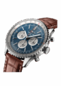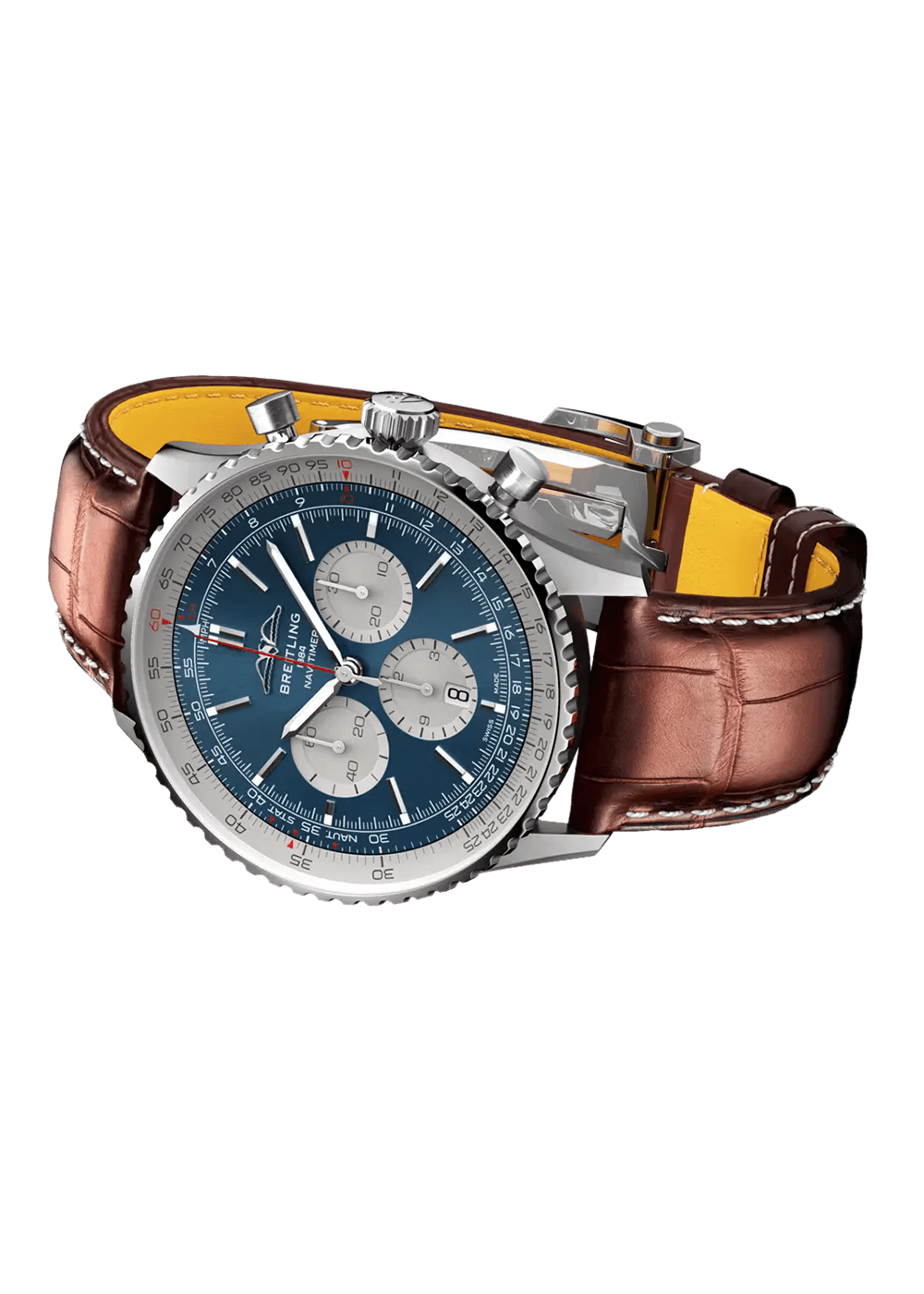 Ein abgeflachter Rechenschieber und ein gewölbtes Glas erzeugen den Eindruck eines kompakteren Profils. Polierte und gebürstete Finishes verleihen den Metallelementen ein hochwertiges, glänzendes, aber dennoch dezentes Aussehen. Getragen von Astronauten im Weltraum und von den grössten Stars der Welt, handelt es sich um den legendärsten Zeitmesser von Breitling und um eine der unverwechselbarsten Uhren aller Zeiten.