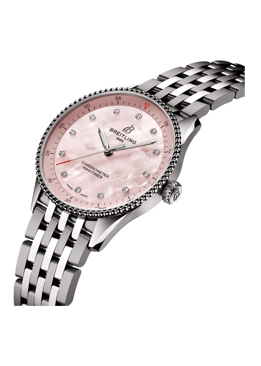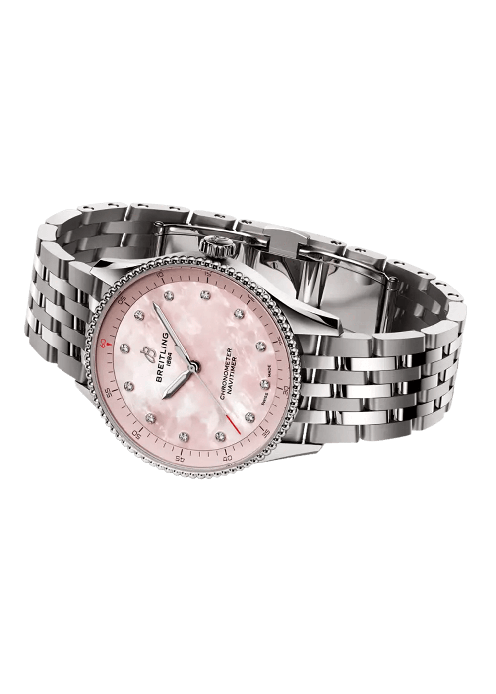 Die Ikone kommt jetzt in den Grössen 36 und 32 mm für Frauen und Männer, die die Optik und Haptik einer Uhr mit kleinerem Durchmesser lieben. Während die 36-mm-Navitimer die Perlenlünette und den ikonischen kreisförmigen Rechenschieber aufweist, die der Navitimer ihr unverkennbares Aussehen verleihen, verzichtet die beeindruckende 32-mm-Variante auf den Rechenschieber zugunsten eines schlichteren Zifferblattdesigns, das auf den schlanken Durchmesser abgestimmt ist.