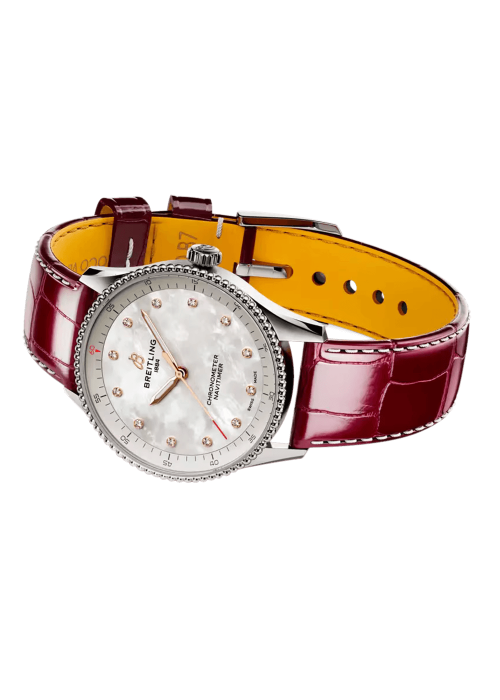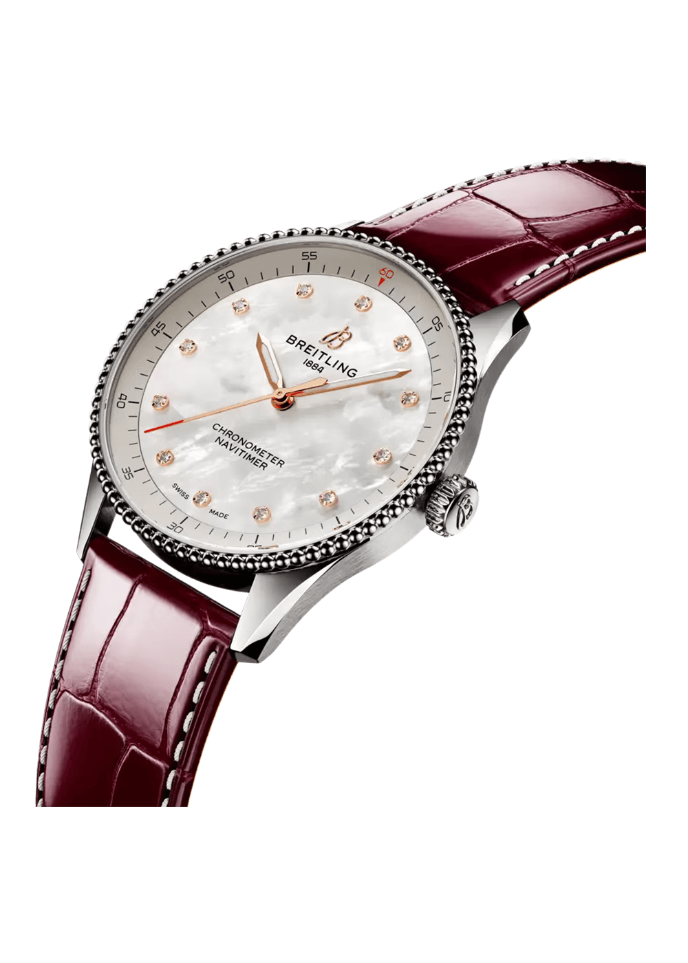 Die Ikone kommt jetzt in den Grössen 36 und 32 mm für Frauen und Männer, die die Optik und Haptik einer Uhr mit kleinerem Durchmesser lieben. Während die 36-mm-Navitimer die Perlenlünette und den ikonischen kreisförmigen Rechenschieber aufweist, die der Navitimer ihr unverkennbares Aussehen verleihen, verzichtet die beeindruckende 32-mm-Variante auf den Rechenschieber zugunsten eines schlichteren Zifferblattdesigns, das auf den schlanken Durchmesser abgestimmt ist.