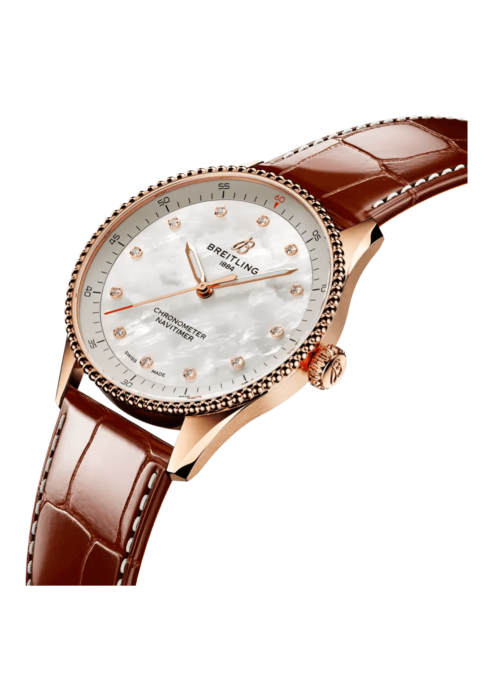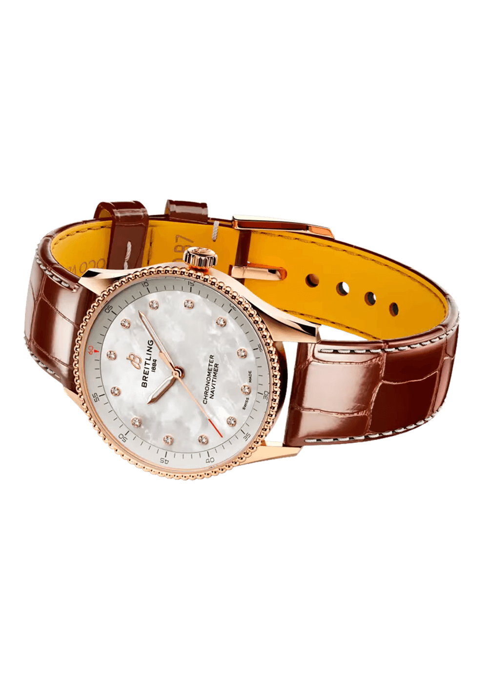 Die Ikone kommt jetzt in den Grössen 36 und 32 mm für Frauen und Männer, die die Optik und Haptik einer Uhr mit kleinerem Durchmesser lieben. Während die 36-mm-Navitimer die Perlenlünette und den ikonischen kreisförmigen Rechenschieber aufweist, die der Navitimer ihr unverkennbares Aussehen verleihen, verzichtet die beeindruckende 32-mm-Variante auf den Rechenschieber zugunsten eines schlichteren Zifferblattdesigns, das auf den schlanken Durchmesser abgestimmt ist.