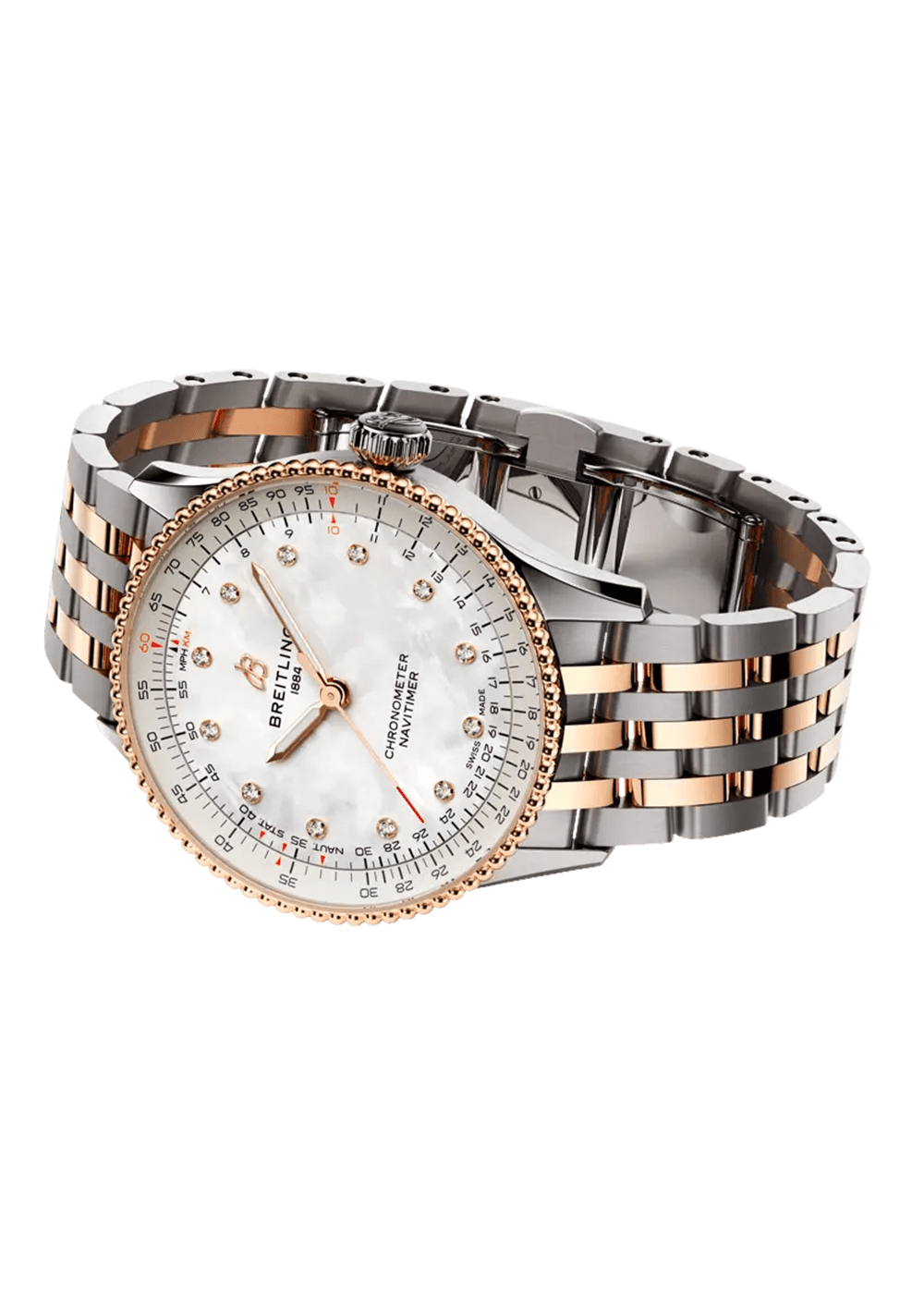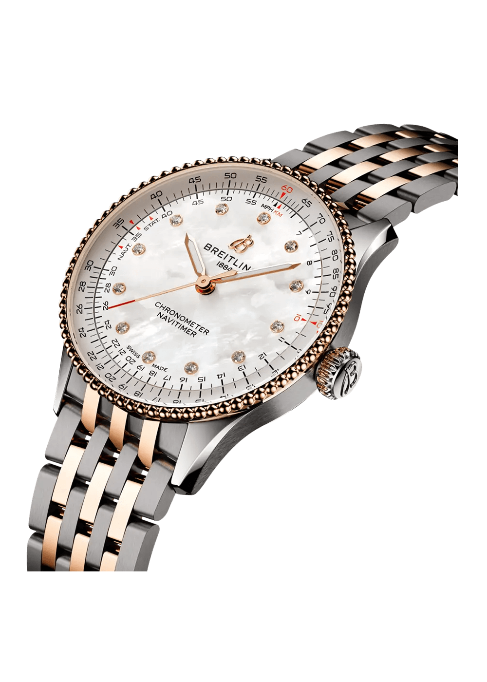Die Ikone kommt jetzt in den Grössen 36 und 32 mm für Frauen und Männer, die die Optik und Haptik einer Uhr mit kleinerem Durchmesser lieben. Während die 36-mm-Navitimer die Perlenlünette und den ikonischen kreisförmigen Rechenschieber aufweist, die der Navitimer ihr unverkennbares Aussehen verleihen, verzichtet die beeindruckende 32-mm-Variante auf den Rechenschieber zugunsten eines schlichteren Zifferblattdesigns, das auf den schlanken Durchmesser abgestimmt ist.