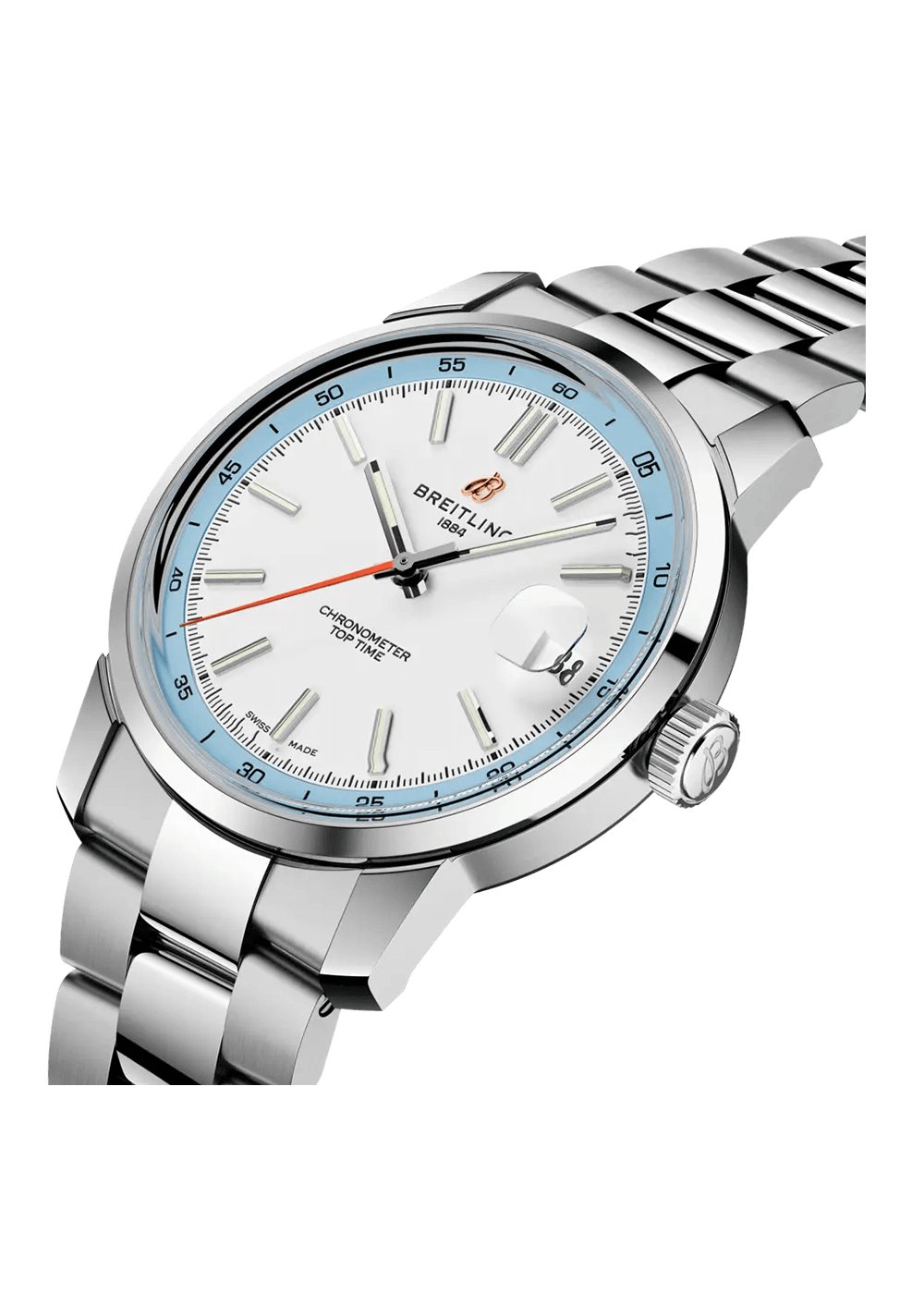 Die im Jahr 2025 neu lancierte Top Time B31 stellt das Debüt des Manufakturwerks B31 im Hause Breitling dar. Das 38-mm-Gehäuse bleibt der DNA der Top Time treu und gewährleistet einen makellosen Stil, der an jedes Handgelenk passt. Die Top Time B31 vereint Retro-Ästhetik mit modernem Anspruch. Das Design des Zifferblatts ist von den Armaturenbrettern der Oldtimer inspiriert, während das 38-mm-Gehäuse ein Gleichgewicht zwischen Vintage-Proportionen und modernem Design schafft und dank seiner universellen Grösse an jedes Handgelenk passt.