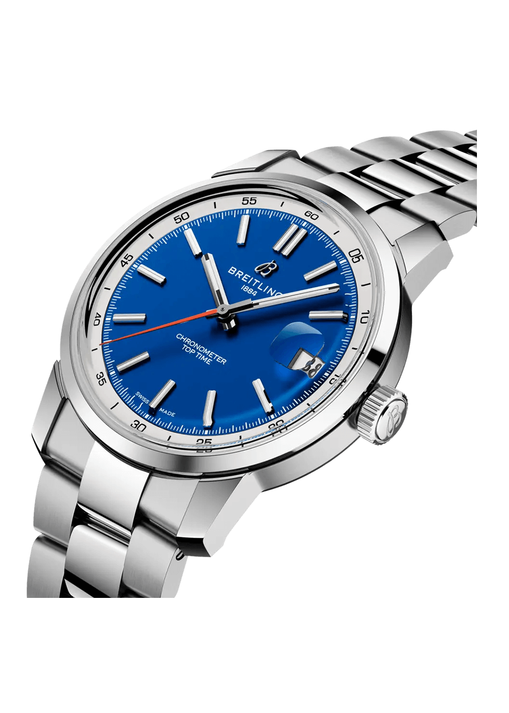 Die im Jahr 2025 neu lancierte Top Time B31 stellt das Debüt des Manufakturwerks B31 im Hause Breitling dar. Das 38-mm-Gehäuse bleibt der DNA der Top Time treu und gewährleistet einen makellosen Stil, der an jedes Handgelenk passt. Die Top Time B31 vereint Retro-Ästhetik mit modernem Anspruch. Das Design des Zifferblatts ist von den Armaturenbrettern der Oldtimer inspiriert, während das 38-mm-Gehäuse ein Gleichgewicht zwischen Vintage-Proportionen und modernem Design schafft und dank seiner universellen Grösse an jedes Handgelenk passt.