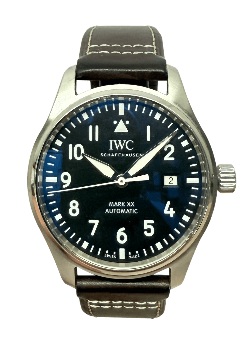 Die IWC Pilot’s Watch Mark XX ist eine moderne Interpretation der klassischen Fliegeruhr – schlicht, funktional und kompromisslos präzise. Ihr 40 mm großes Edelstahlgehäuse beherbergt ein tiefschwarzes Zifferblatt mit leuchtstarken Indizes und markanten Zeigern, die selbst in völliger Dunkelheit ablesbar bleiben – ganz im Sinne der ursprünglichen Pilotenuhren.