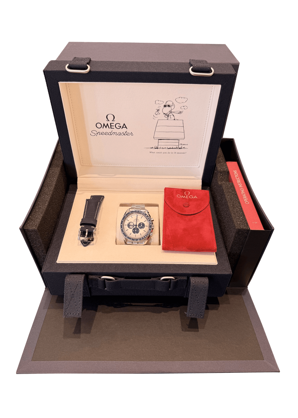 Diese Uhr zum 50. Jubiläum erinnert an den „Silver Snoopy Award“, den OMEGA 1970 von Astronauten der NASA als Anerkennung des Engagements der Marke in der Weltraumforschung und auch während der Apollo 13 Mission erhielt.