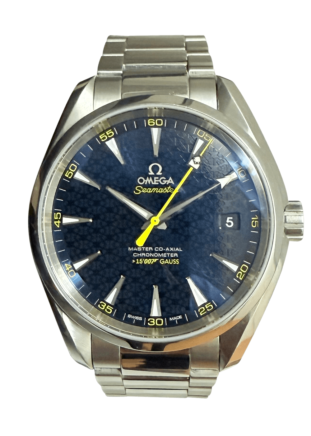 Diese Omega Seamaster Aqua Terra ist eine limitierte Sonderedition zum James-Bond-Film Spectre und auf 15 007 Exemplare weltweit begrenzt. Sie kombiniert ein elegantes blaues Zifferblatt mit subtilen Bond-Designelementen wie dem Familienwappen auf dem Sekundenzeiger und einem Rotor im “Gun Barrel”-Design. Angetrieben vom präzisen Co-Axial Master Chronometer Kaliber 8507, vereint sie Stil, Technik und Sammlerwert auf höchstem Niveau.