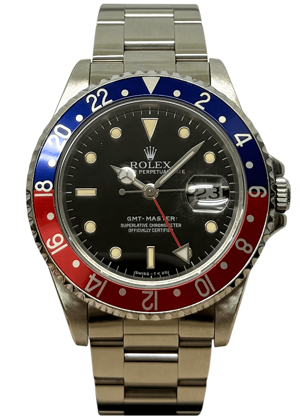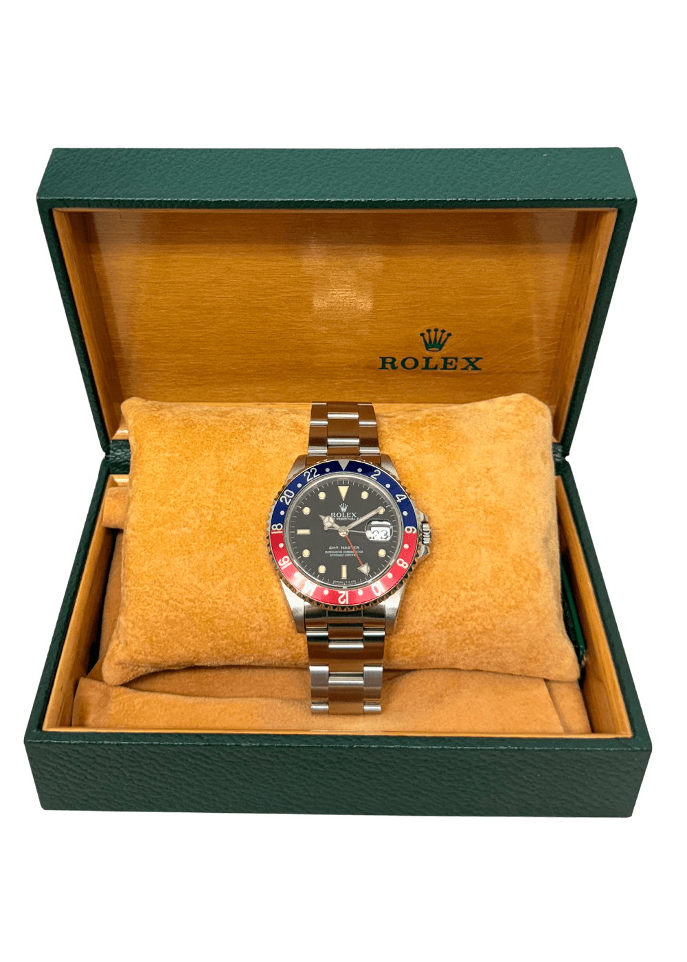 Diese GMT-Master ist ein faszinierendes Übergangsmodell, das die Brücke zwischen den Vintage-Wurzeln und der modernen Funktionalität schlägt. Als letzte Referenz, die schlicht unter dem Namen „GMT-Master“ geführt wurde, besticht sie durch ihr flacheres Gehäuseprofil, das für einen besonders hohen Tragekomfort am Handgelenk sorgt. Mit ihrem robusten Edelstahlgehäuse und dem ikonischen Aluminium-Inlay der beidseitig drehbaren Lünette verkörpert sie den authentischen Toolwatch-Charakter einer vergangenen Ära, während sie bereits mit einem kratzfesten Saphirglas ausgestattet ist.