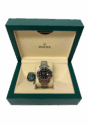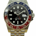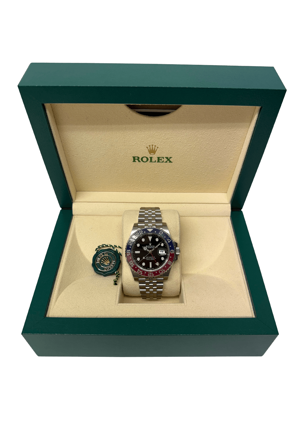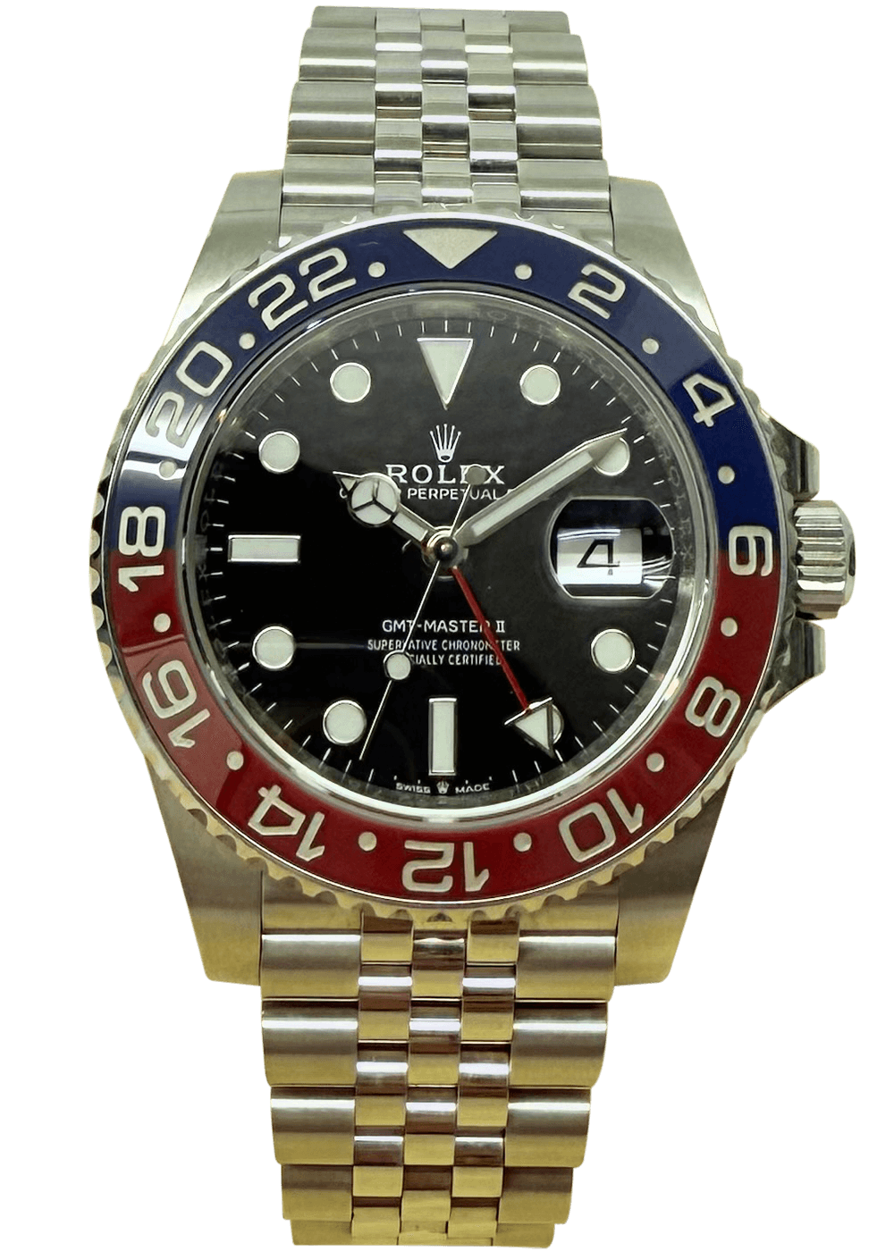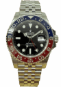 Dieses Modell verfügt über ein Zifferblatt in Schwarz und eine zweifarbige Cerachrom-Zahlenscheibe aus roter und blauer Keramik. In Ergänzung zu den traditionellen Stunden-, Minuten- und Sekundenzeigern besitzt die GMT‑Master II einen zusätzlichen Zeiger mit pfeilförmiger Spitze, der sich in 24 Stunden einmal um das Zifferblatt dreht, sowie eine in beide Richtungen drehbare Lünette mit 24-Stunden-Graduierung.