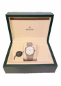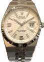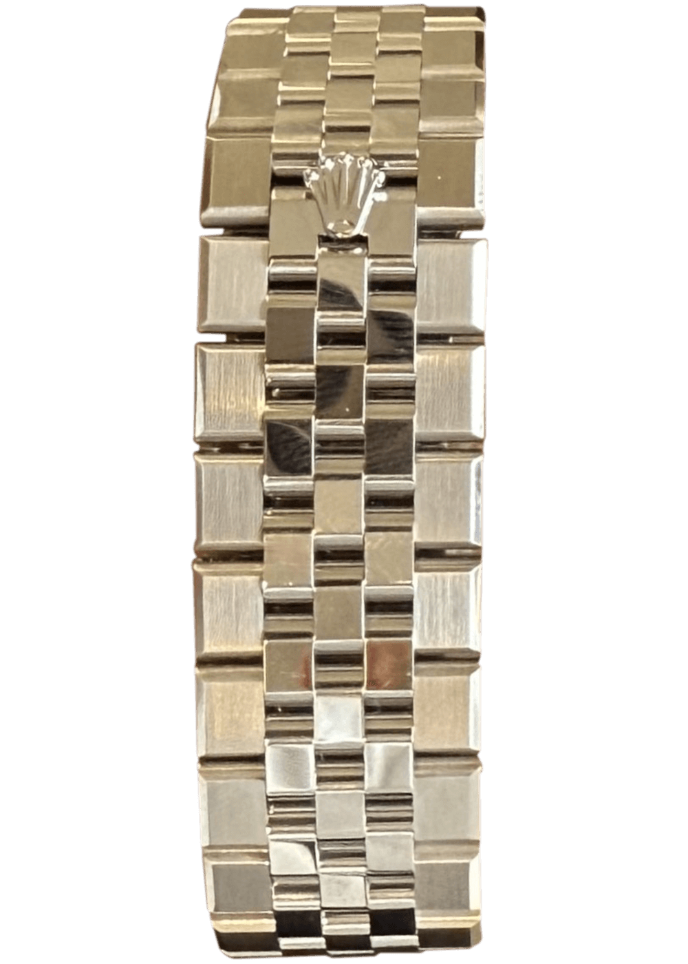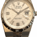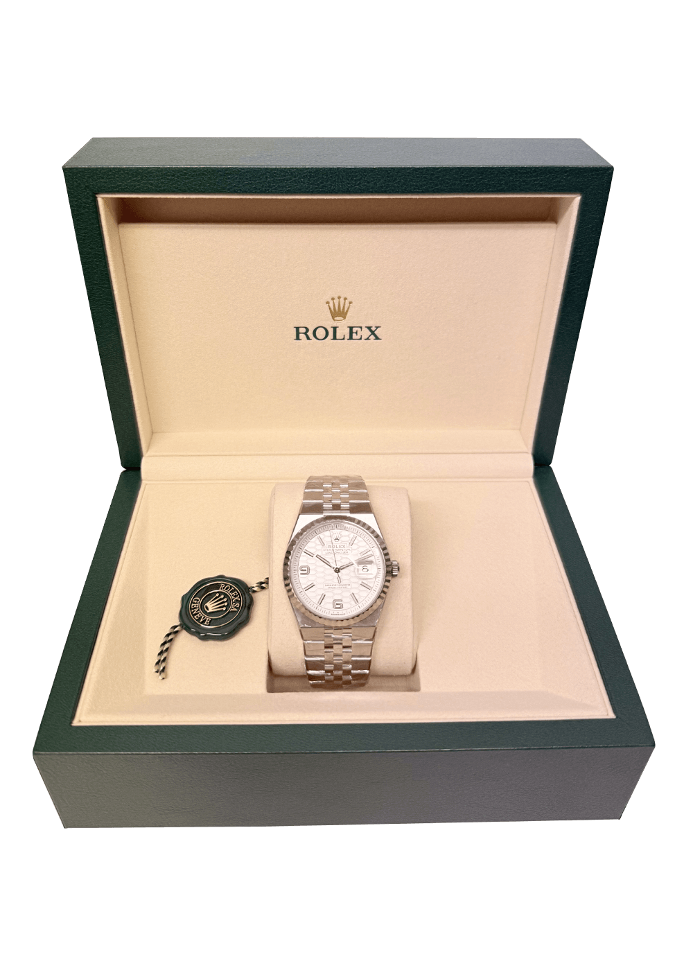 Diese Rolex Land-Dweller in 36 mm ist eine innovative Interpretation der klassischen Oyster-Architektur. Das markanteste Merkmal ist das Zifferblatt mit einem feinen, satinierten Wabenmuster, das eine besondere Tiefe erzeugt. Das Gehäuse geht nahtlos in das neu entwickelte ‚Flat Jubilee‘-Band über, was der Uhr eine integrierte und fließende Ästhetik verleiht. Eingerahmt wird das Gesicht der Uhr von der charakteristischen geriffelten Lünette
