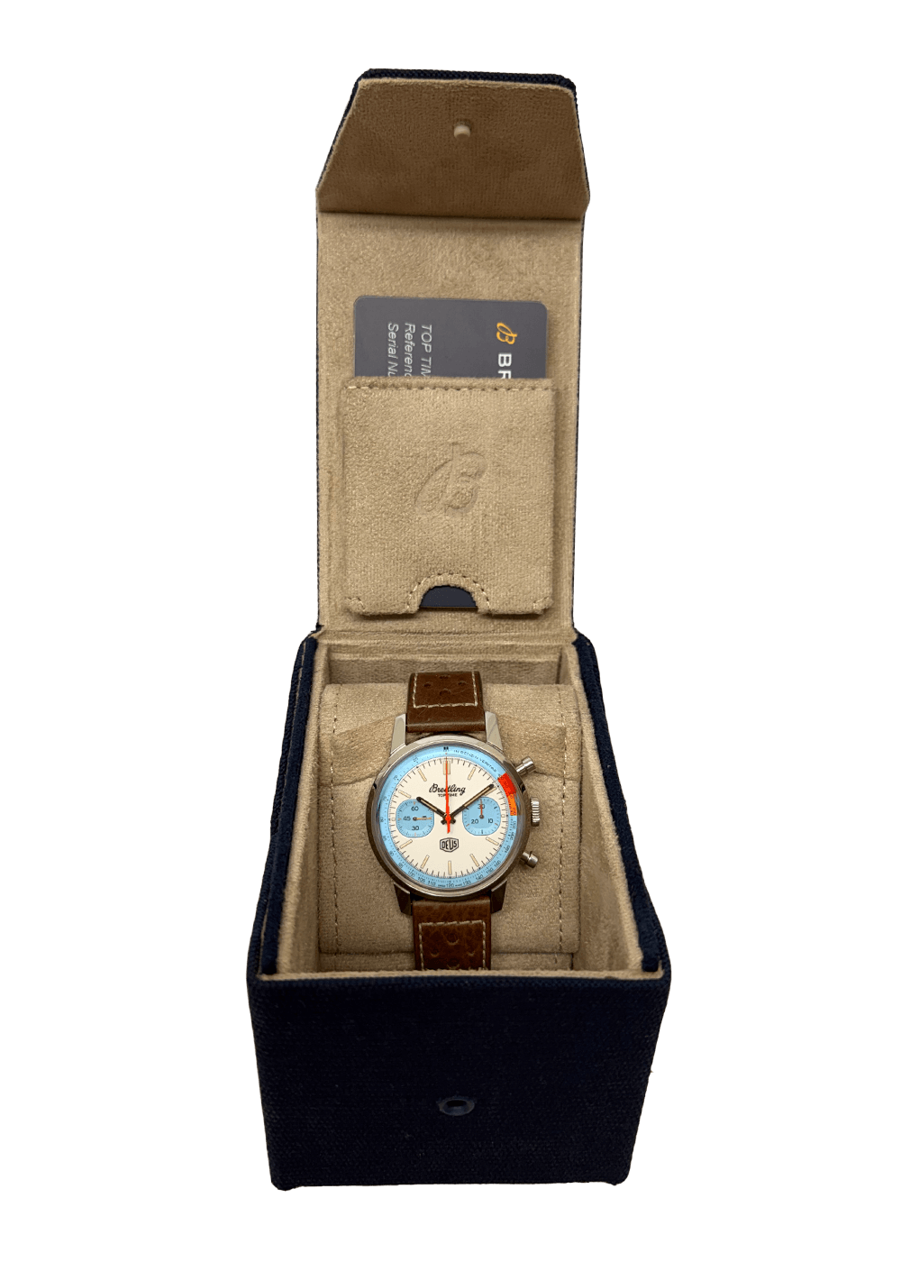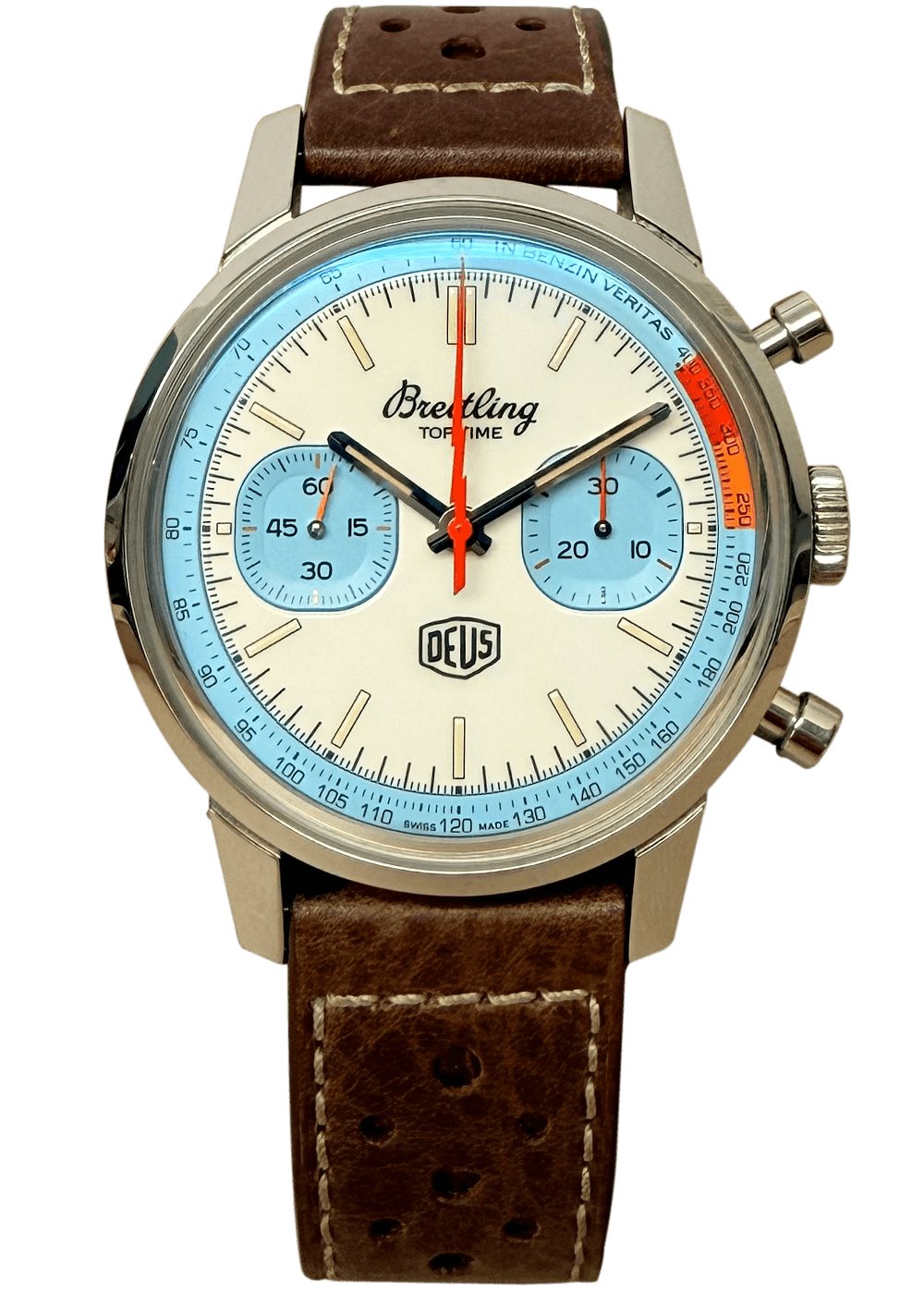 Diese Breitling Top Time ist eine auf 2.000 Exemplare limitierte Sonderedition, die in Zusammenarbeit mit der australischen Lifestyle-Marke Deus Ex Machina entstand. Der Chronograph verfügt über ein 41-mm-Edelstahlgehäuse, das mit klassischen Pilzdrückern ausgestattet ist.