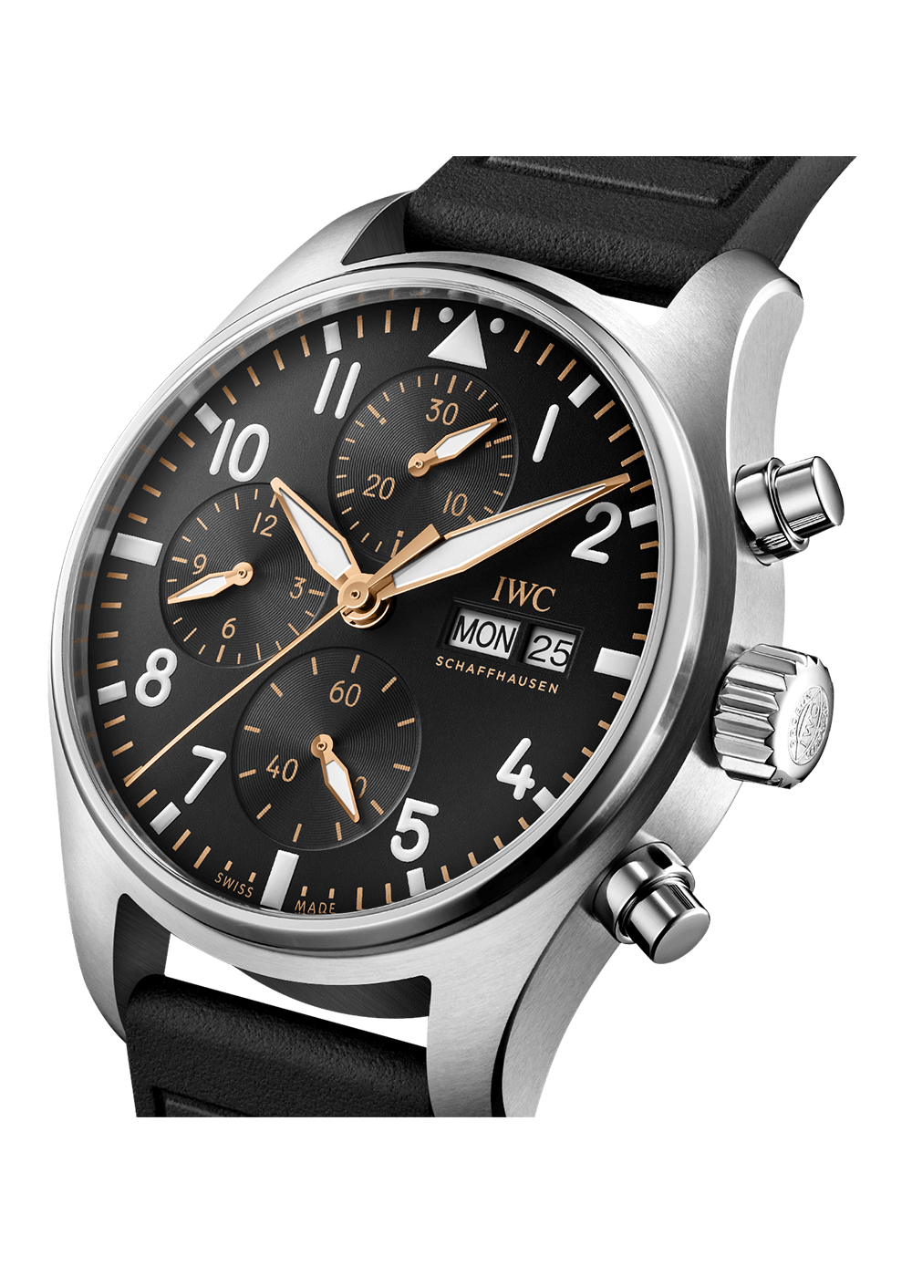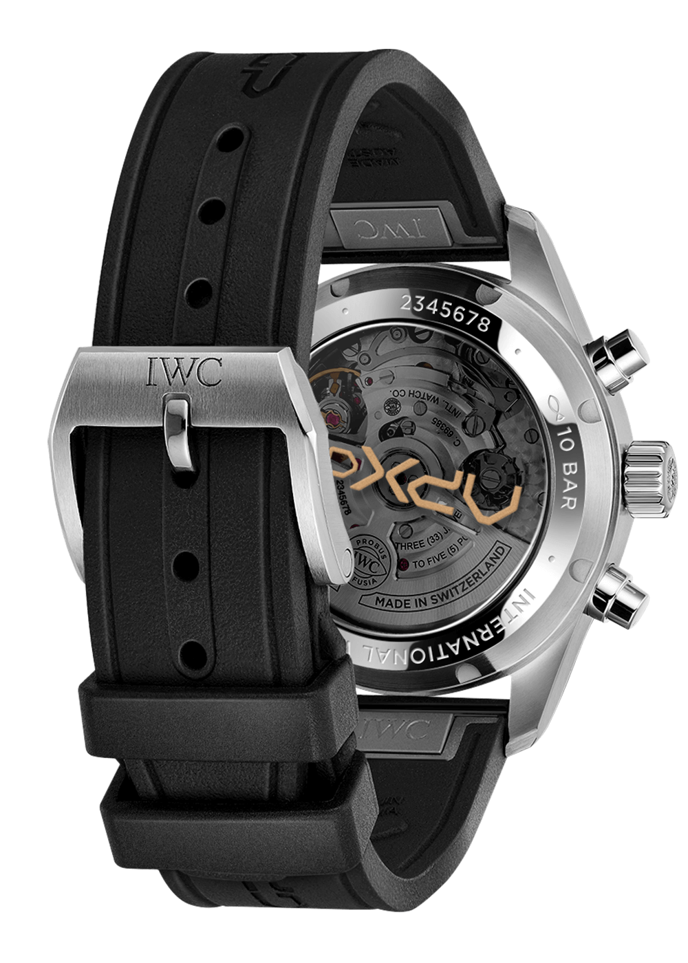 Die Pilot’s Watch Chronograph 41 APXG ist dem fiktiven „APXGP“-Team aus dem Film F1® gewidmet. Sein Farbcode in Schwarz, Weiss und Gold ist von den Farben des Teams inspiriert. Das 41 Millimeter grosse Edelstahlgehäuse wird mit einem schwarzen Zifferblatt kombiniert, das mit weissen Ziffern und goldenen Minutenzählern bedruckt ist. Die Minuten- und Stundenzeiger sowie die Zeiger der Hilfszifferblätter sind vergoldet und mit weisser Super-LumiNova® gefüllt. Auf dem getönten Saphirglasboden ist das „APXGP“-Logo in Gold aufgedruckt, während eine besondere Lasergravur auf dem strapazierfähigen und wasserdichten schwarzen Kautschukband ebenfalls an das fiktive Team aus dem Film erinnert.