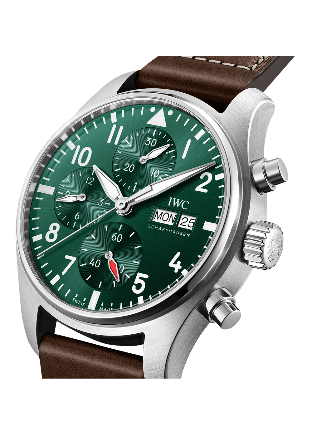 Die im 2021 vorgestellte Fliegeruhr verfügt über ein Edelstahlgehäuse im kompakten Durchmesser von 41 Millimetern und ist entweder mit einem blauen oder grünen Zifferblatt erhältlich. Um die Kompetenz der Marke bei der Entwicklung eigener Uhrwerke zu unterstreichen, wird es vom IWC Manufakturkaliber 69385 angetrieben, das durch einen Saphirglasboden sichtbar ist. Mit dem neuen EasXCHANGE- System und einer Auswahl an Armbändern aus Kalbsleder, Kautschuk oder Edelstahl ist die neue Pilot’s Watch Chronograph 41 die ultimative Sportuhr.