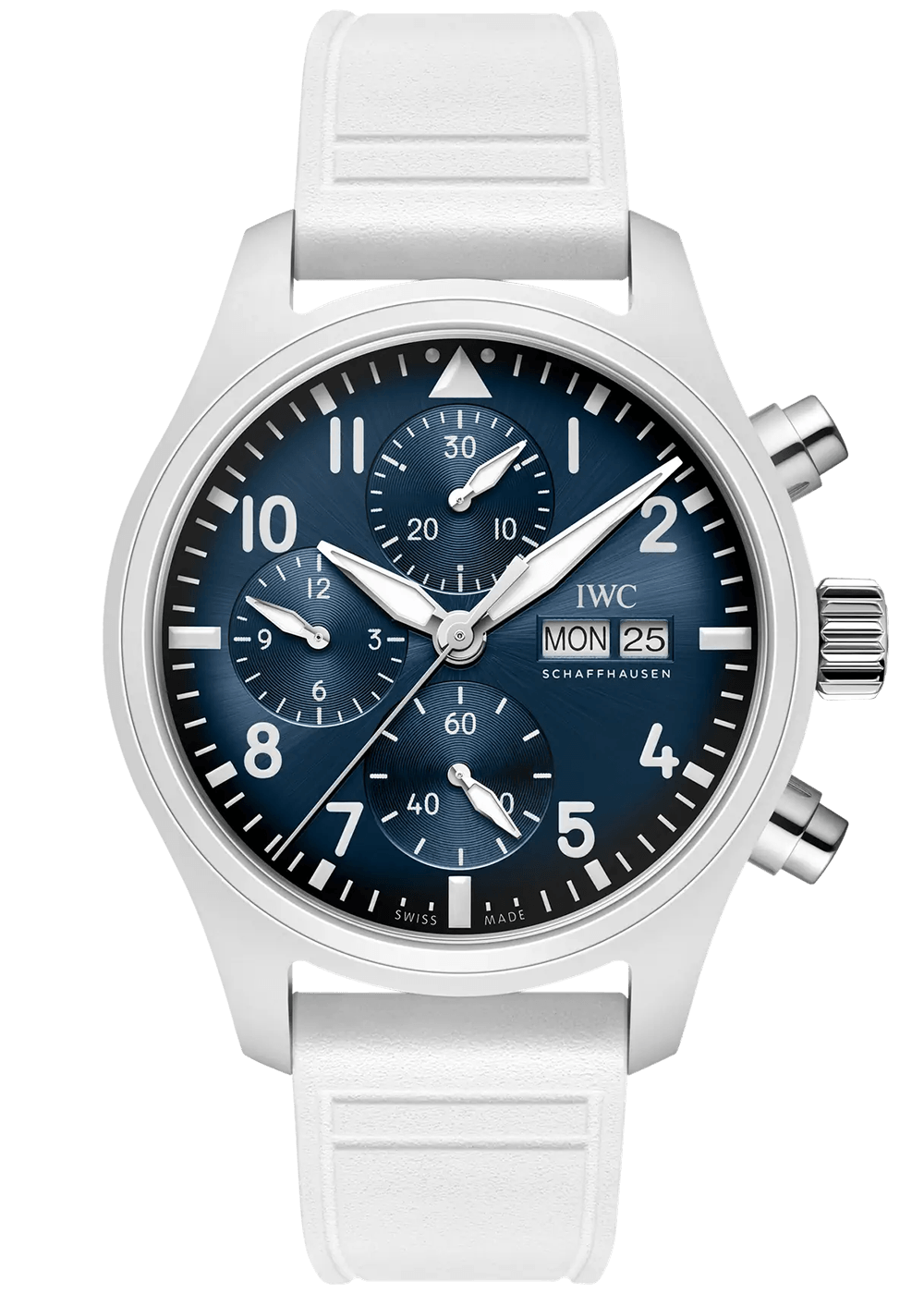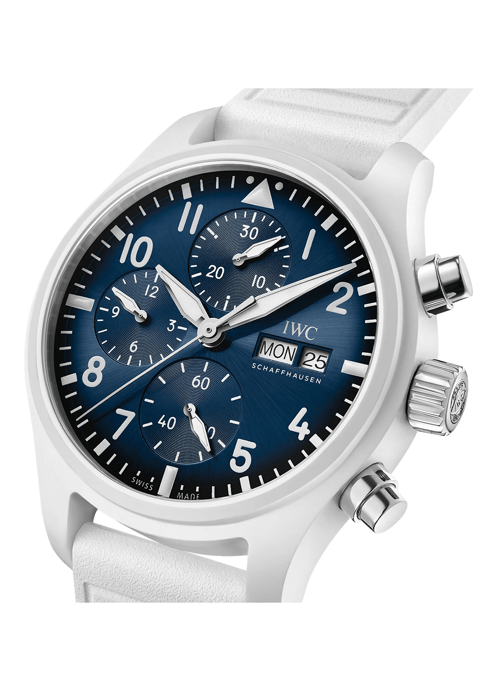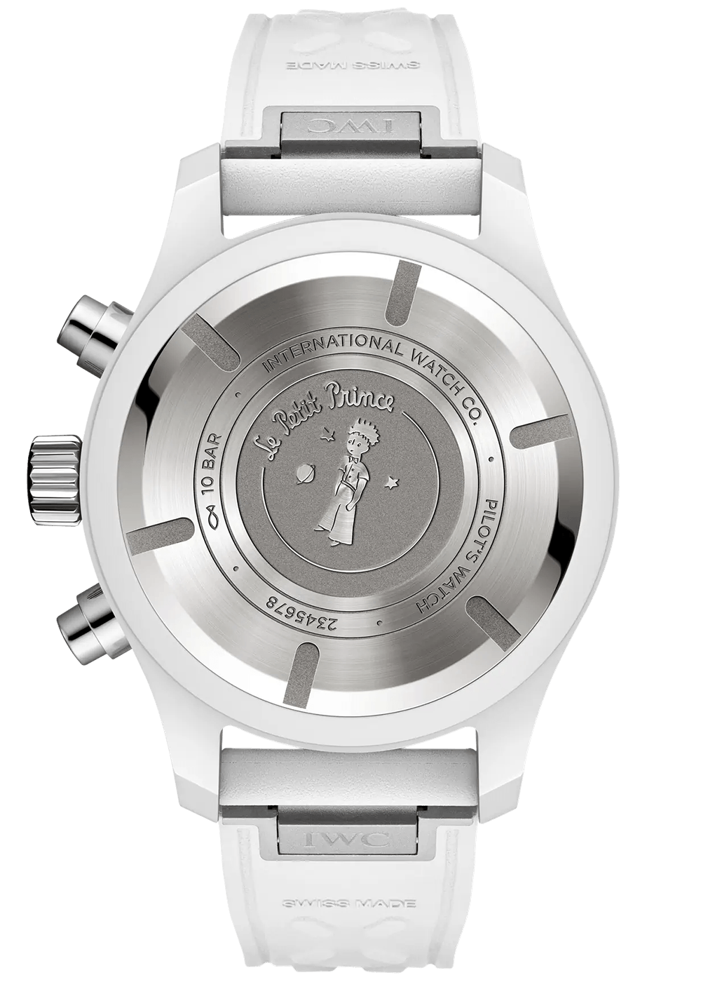Die Pilot’s Watch Chronograph 41 Le Petit Prince verbindet die zeitlose Faszination von Antoine de Saint-Exupérys berühmter Erzählung mit den aussergewöhnlichen Materialeigenschaften und der unverwechselbaren Ästhetik des weissen Keramik.