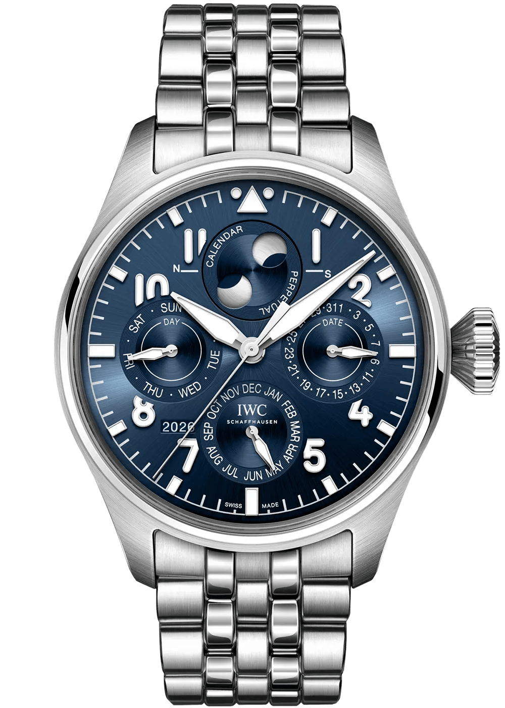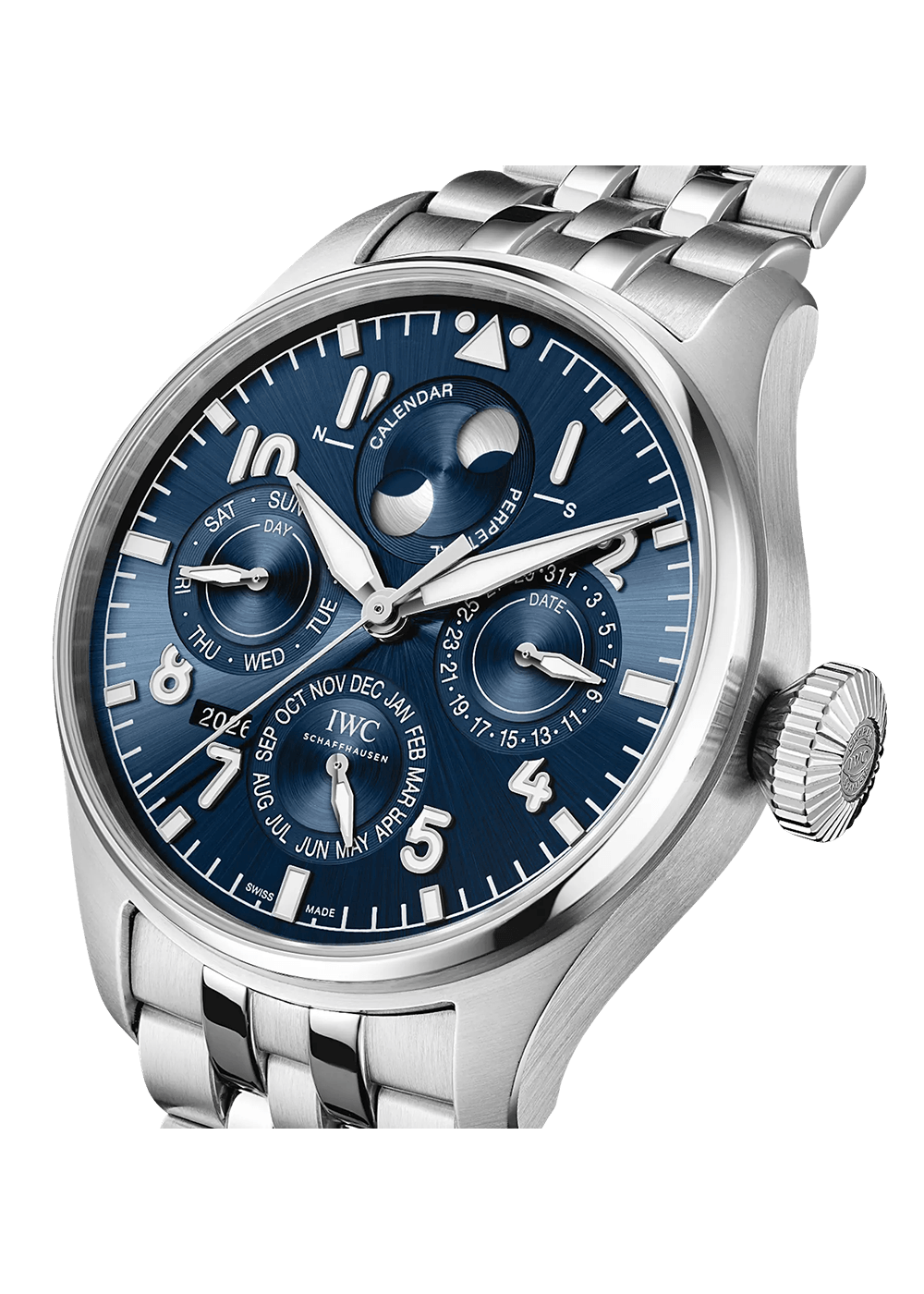 Die „Big Pilot’s Watch Perpetual Calendar ProSet Le Petit Prince“ vereint ein Edelstahlgehäuse und -armband mit einem tiefblauen Zifferblatt mit Sonnenschliff. Der Perpetual Calendar ProSet lässt sich über eine einzige Krone sowohl vorwärts als auch rückwärts einstellen, wodurch die Kalendereinstellung ebenso einfach und intuitiv ist wie das Einstellen der Uhrzeit.