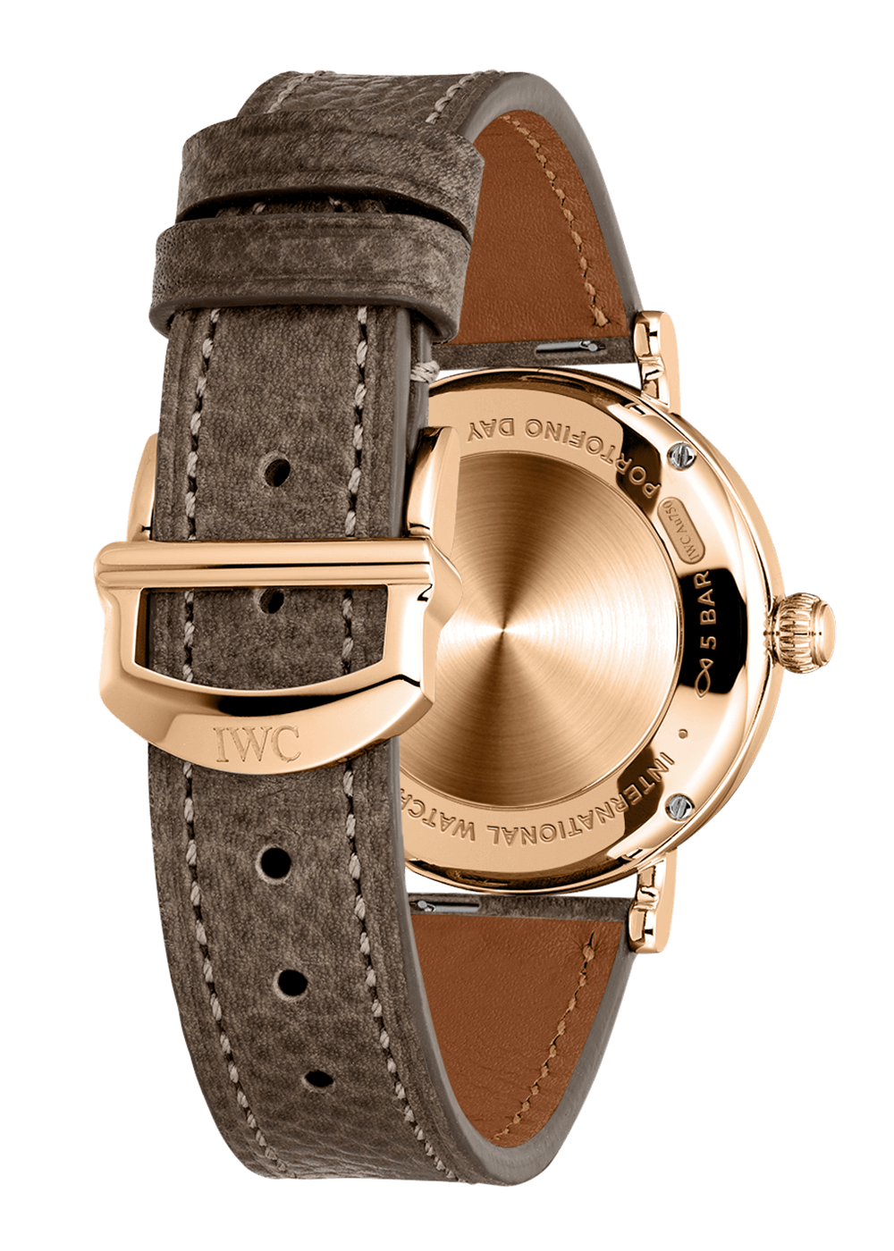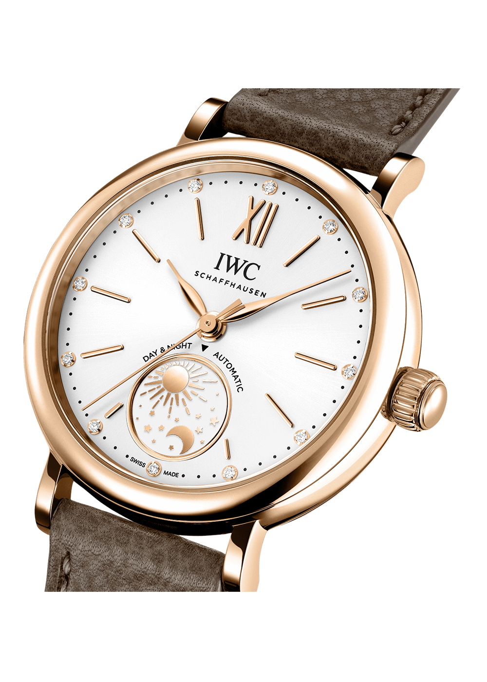 Die Portofino Automatic Day & Night 34 verfügt über eine Tag- und Nacht-Komplikation. Eine kleine Scheibe bei 6 Uhr zeigt an, ob es gerade Tag oder Nacht ist. Zur Mittagszeit oder um Mitternacht erscheint entweder die Sonne oder der Mond im oberen Bereich.