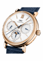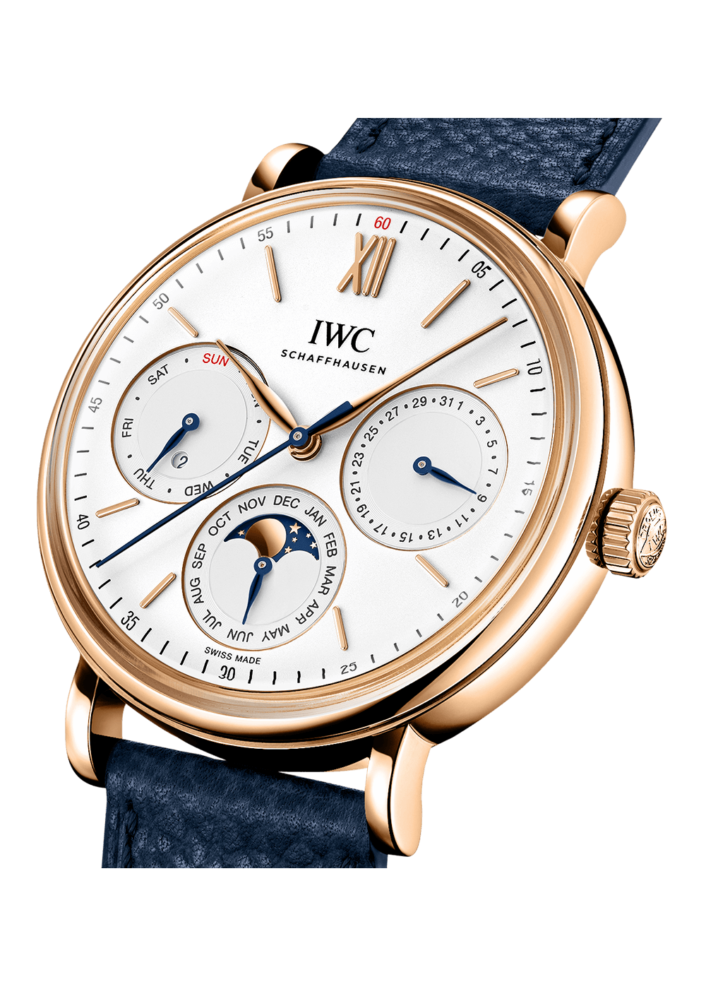 Die Portofino Perpetual Calendar ist mit dem legendären ewigen Kalender ausgestattet, der in den 1980er Jahren von Kurt Klaus entwickelt wurde. Mit einem Durchmesser von nur 40 Millimetern ist diese Uhr der kleinste ewige Kalender im Portfolio von IWC. Diese Version verfügt über ein Gehäuse aus 18 Karat Rotgold, ein argentéfarbenes Zifferblatt sowie vergoldete Zeiger und Appliken.