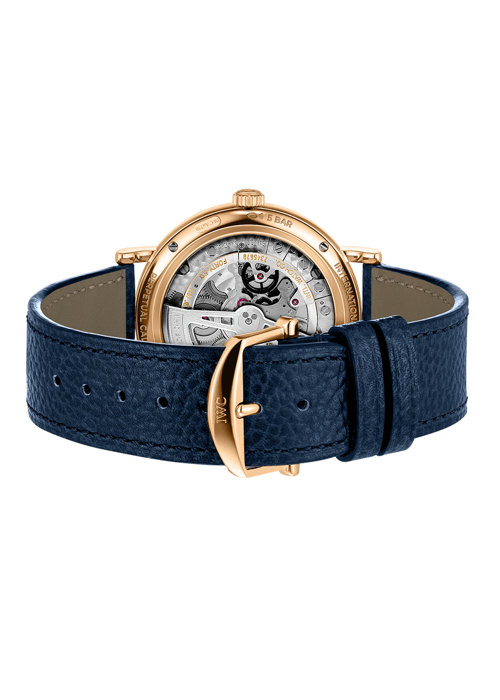 Der ausgeklügelte Mechanismus ist mechanisch so programmiert, dass er die unterschiedlichen Längen der Monate sowie die Schaltjahre erkennt. Er läuft vollkommen autonom, ohne jegliche manuelle Anpassungen, bis zum Jahr 2100. Das IWC-Manufakturkaliber 82650 lässt sich durch einen Sichtboden betrachten.