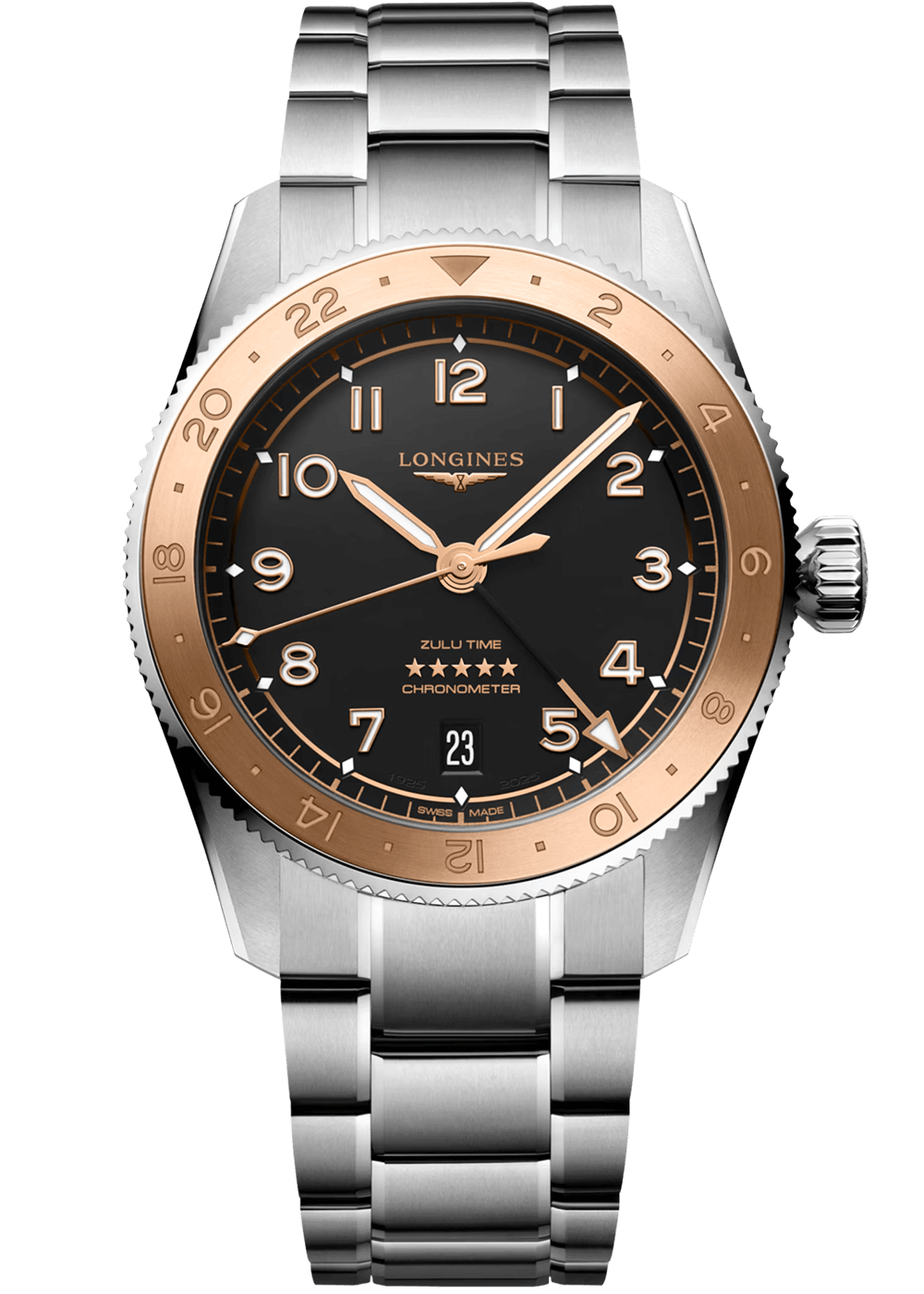 Die LONGINES Spirit Zulu Time verkörpert das jahrhundertealte Know-how der Marke bei Zeitmessern mit mehreren Zeitzonen. Ihr Ursprung und ihr Name sind von der ersten LONGINES Armbanduhr mit zwei Zeitzonen entlehnt, die 1925 hergestellt wurde und auf deren Zifferblatt die Zulu-Flagge abgebildet war.