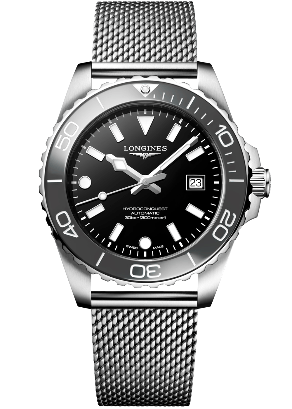 Die HYDROCONQUEST Kollektion vereint moderne Ästhetik mit nachweislicher Leistung. Angetrieben von einem exklusiven LONGINES Kaliber, wasserdicht bis zu 30 bar (300 m), mit einseitig drehbarer Lünette, verschraubter Krone und verschraubtem Gehäuseboden.