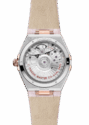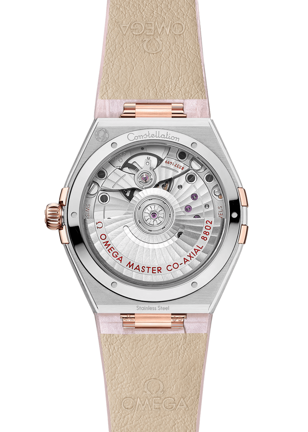 Angetrieben wird dieser Zeitmesser mit beigefarbenem Lederarmband von dem OMEGA Co-Axial Master Chronometer Kaliber 8802, das durch das gewölbte kratzresistente Saphirglas sichtbar ist.