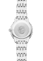Das blaue PVD-Zifferblatt dieses 30-mm-Edelstahlmodells ist mit einem Sonnenschliff versehen. Die Anzeige zeichnet sich durch rhodinierte Zeiger sowie abwechselnd römische Ziffern und Cabochon-Indizes aus.