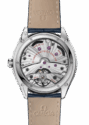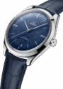 Dieses Modell besitzt ein 40-mm-Gehäuse aus Edelstahl, das von einem blauen Lederarmband am Handgelenk gehalten wird. Das gewölbte, blau gemusterte Zifferblatt verfügt über ein Datumsfenster bei 6 Uhr sowie Zeiger und Indizes aus 18 Karat Weissgold.
