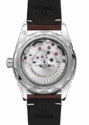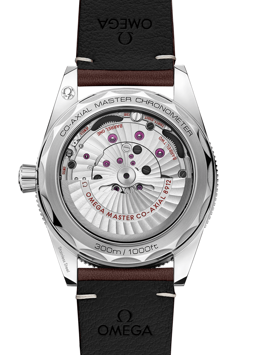 Dieser Zeitmesser wird an einem braunen Lederarmband präsentiert und verfügt über einen transparenten Saphirglasboden, der einen klaren Blick auf das OMEGA Co-Axial Master Chronometer Kaliber 8912 mit 60 Stunden Gangreserve ermöglicht.