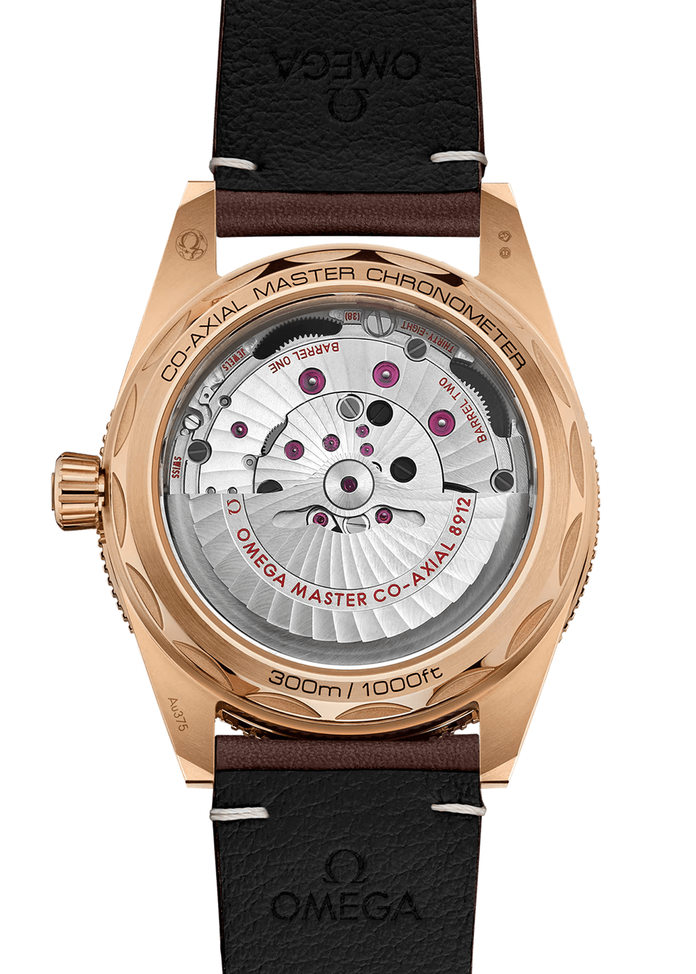 Dieser Zeitmesser wird an einem braunen Lederarmband mit einer Dornschliesse aus 9K-Bronzegold präsentiert und verfügt über einen transparenten Saphirglasboden, der einen klaren Blick auf das OMEGA Co-Axial Master Chronometer Kaliber 8912 mit 60 Stunden Gangreserve ermöglicht.