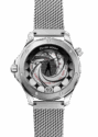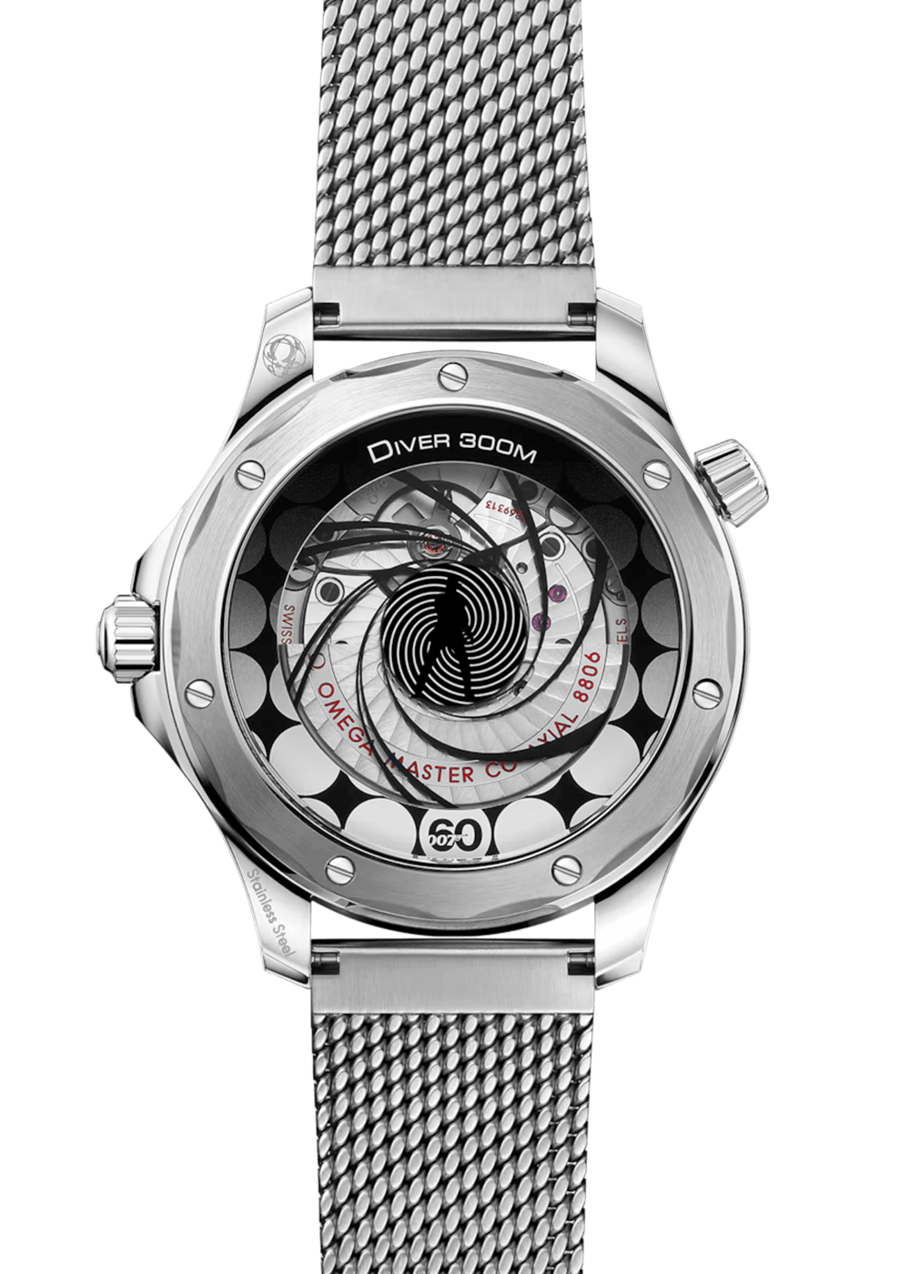 Die 42 mm grosse Seamaster Diver 300M mit Edelstahlgehäuse hat ein wunderschön kontrastierendes blaues Zifferblatt mit skelettierten, rhodinierten Zeigern für Stunden und Minuten und einem Lollipop-Sekundenzeiger aus weiss lackiertem Aluminium. Die berühmte Eröffnungssequenz mit der Silhouette von Bond und dem sich drehenden Gewehrlauf ist auf dem Gehäuseboden unter einem mit einer mikrostrukturierten Metallisierung versehenen Saphirglas zu sehen. Der animierte „Moiré“-Effekt ist mit der Drehung des Lollipop-Sekundenzeigers verbunden, sodass die Animation niemals anhält.