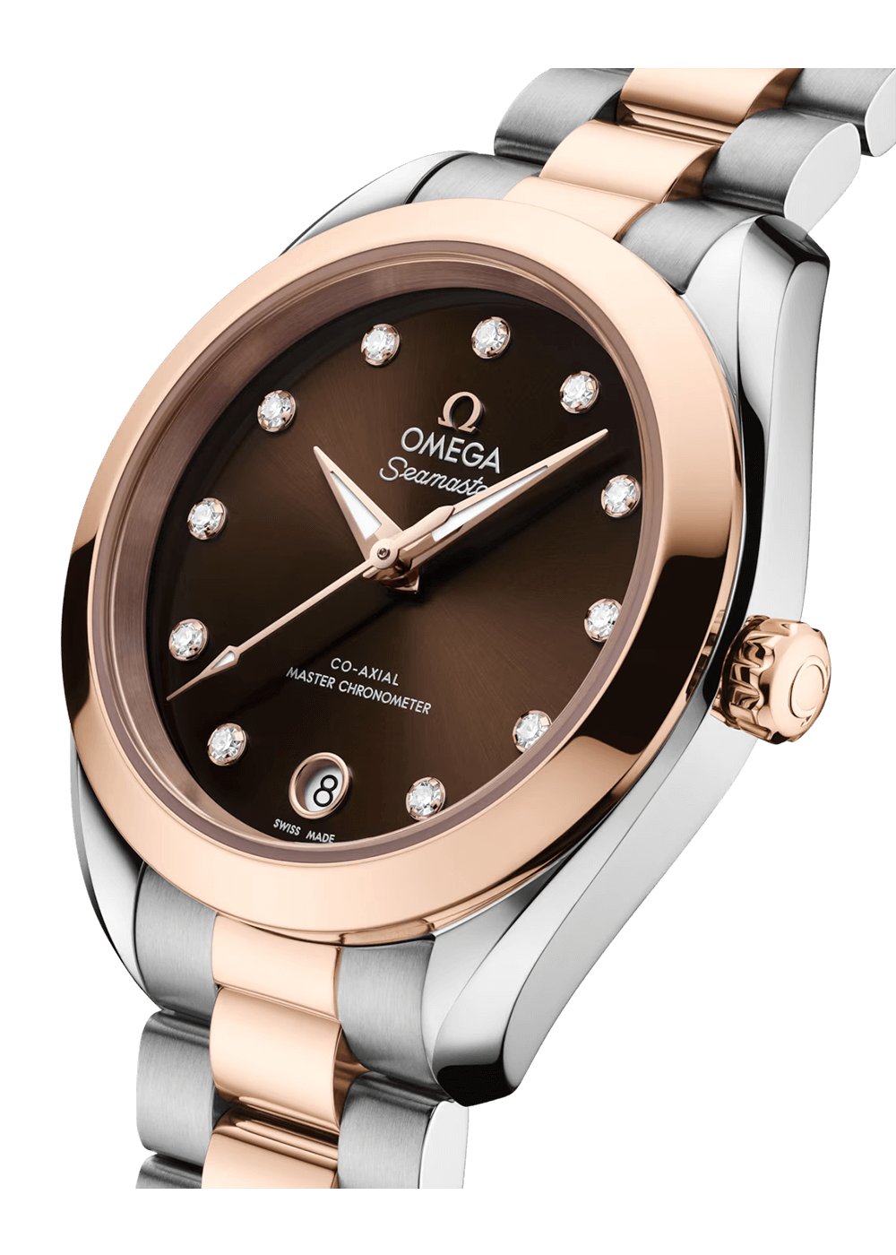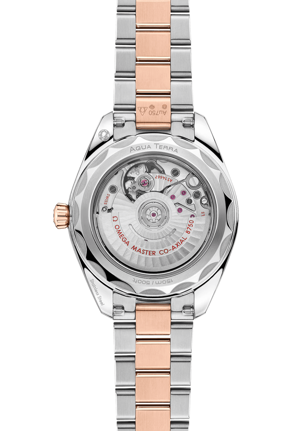 Die Seamaster Aqua Terra ist eine Hommage an OMEGAs großes maritimes Erbe. Seine zarten Proportionen hat das schlanke 30-mm-Gehäuse dieser Uhr dem innovativen OMEGA Co-Axial Master Chronometer Kaliber 8751 zu verdanken, das vom Eidgenössischen Institut für Metrologie (METAS) nach den höchsten Standards der Branche zertifiziert wurde.