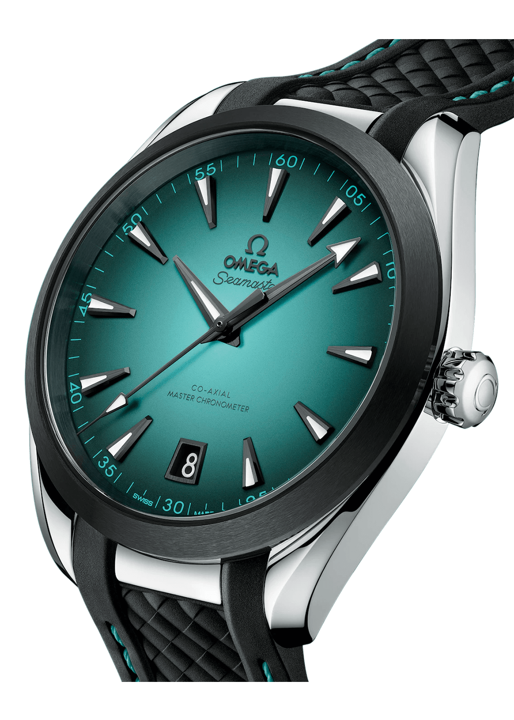 Die Seamaster Aqua Terra ist eine Hommage an OMEGAs großes maritimes Erbe. Dieses 41-mm-Modell verfügt über ein symmetrisches Gehäuse aus Edelstahl und eine Lünette aus gebürsteter schwarzer Keramik.