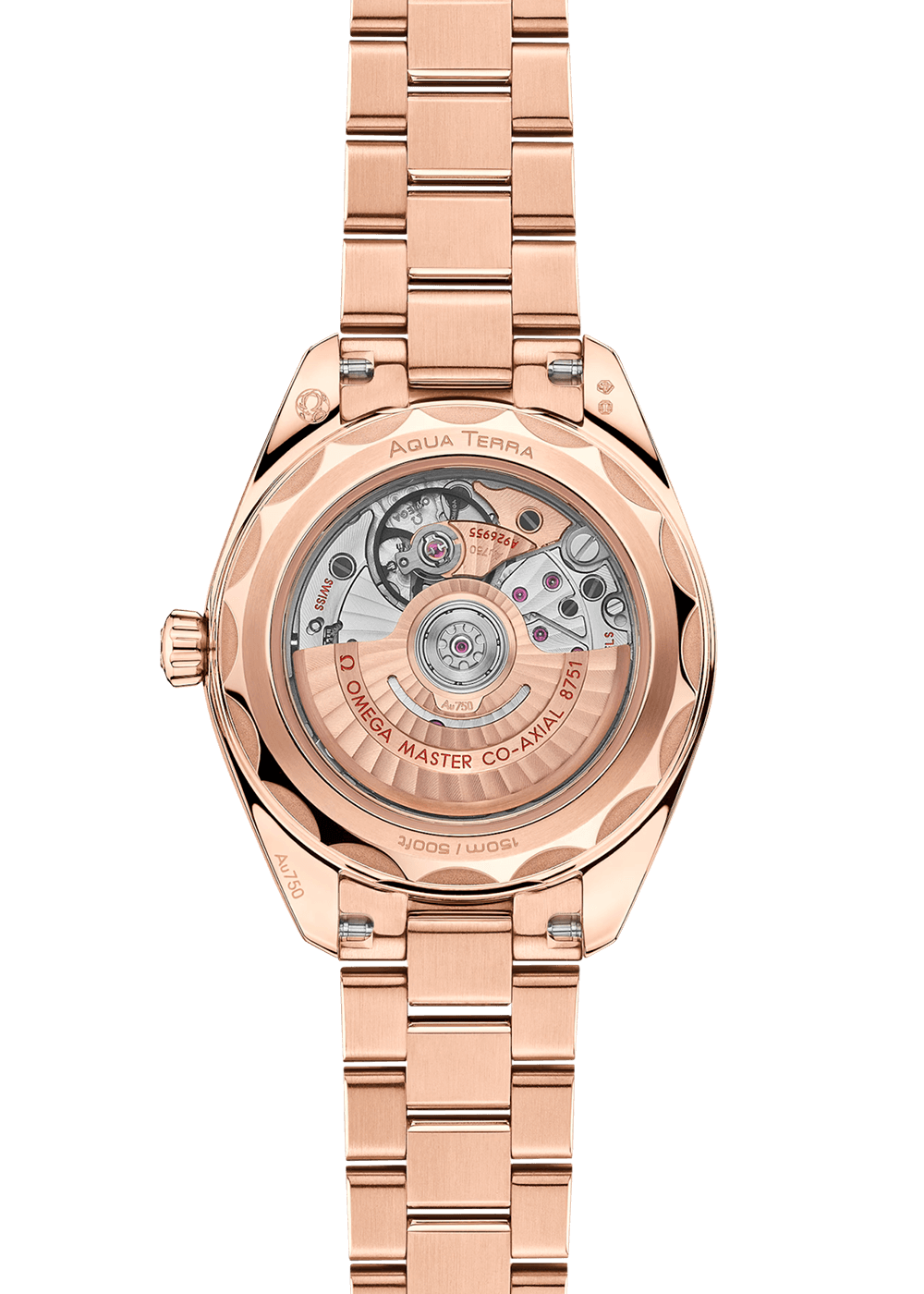 Die Seamaster Aqua Terra ist eine Hommage an OMEGAs großes maritimes Erbe. Seine zarten Proportionen hat das schlanke 30-mm-Gehäuse dieser Uhr dem innovativen OMEGA Co-Axial Master Chronometer Kaliber 8751 zu verdanken, das vom Eidgenössischen Institut für Metrologie (METAS) nach den höchsten Standards der Branche zertifiziert wurde.
