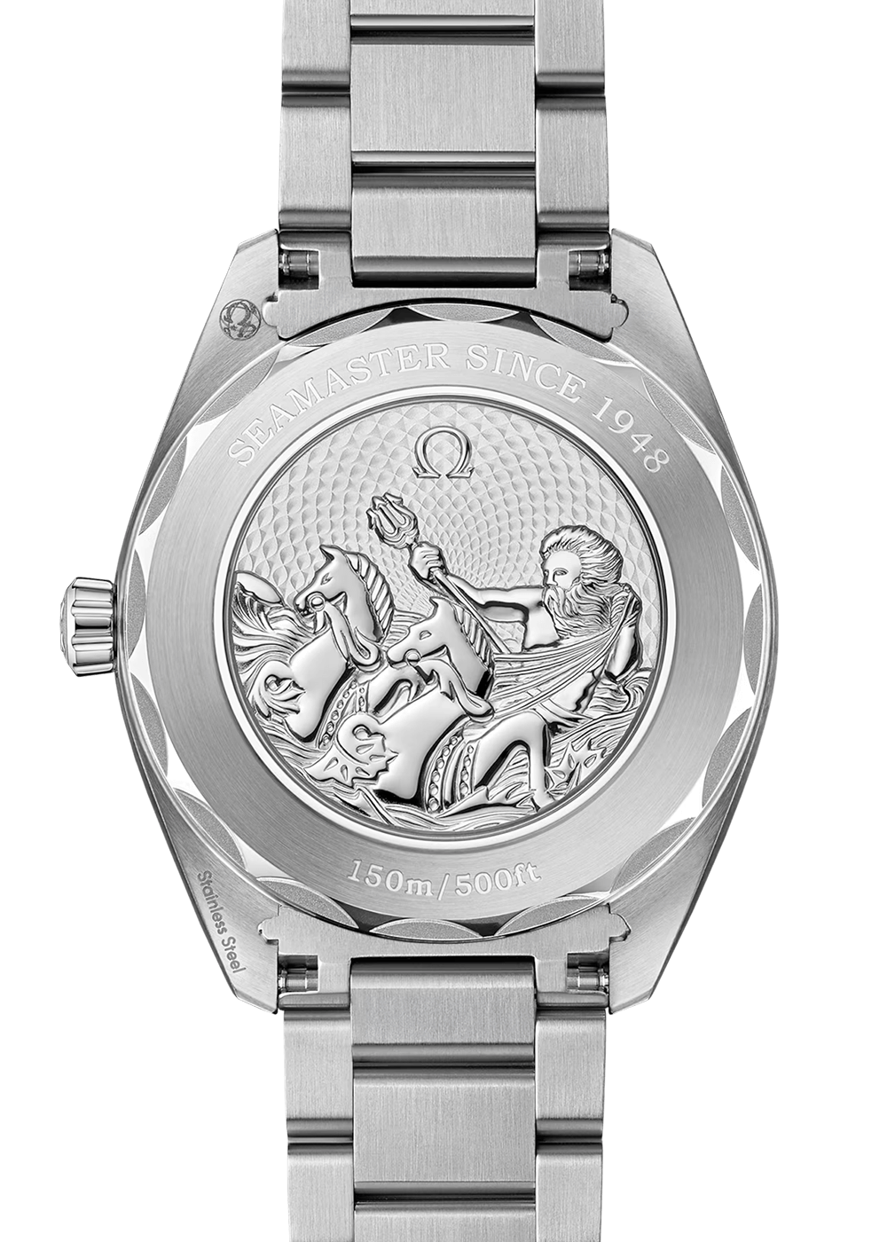 Auf der Rückseite der Uhr ist ein geprägtes Seamaster Gedenklogo zu sehen, das einen Poseidon mit Dreizack und zwei Seepferdchen zeigt: OMEGAs ursprüngliches Design von 1956 und aktuelles Markenemblem. Dahinter befindet sich OMEGAs Co-Axial Master Chronometer Kaliber 8900, das vom Eidgenössischen Institut für Metrologie (METAS) gemäss den höchsten Normen der Branche zertifiziert wurde.
