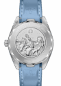 Das Zifferblatt mit „Teak“-Muster in OMEGAs eigenem Summer Blue verfügt über einen Sonnenschliff, eine PVD-Beschichtung und einen lackierten Farbverlauf, der die Wasserdichtigkeit der Uhr symbolisiert. Es besticht durch rhodinierte Zeiger, mit einzigartiger hellblauer Super-LumiNova gefüllte Indizes sowie eine blaue Datumsanzeige bei 6 Uhr.