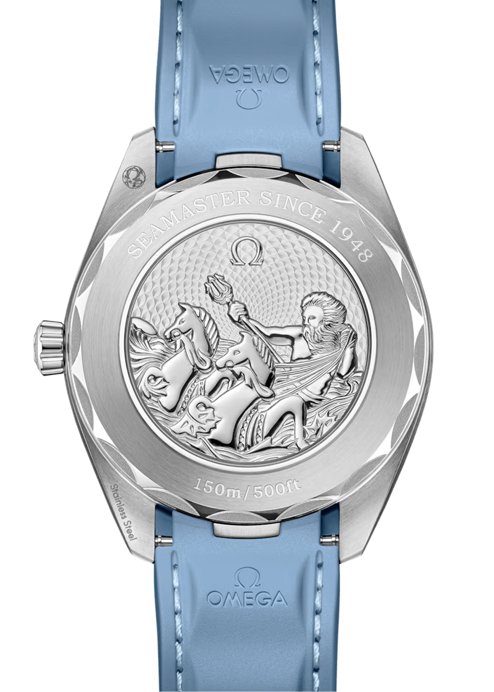 Auf der Rückseite der Uhr ist ein geprägtes Seamaster Gedenklogo zu sehen, das einen Poseidon mit Dreizack und zwei Seepferdchen zeigt: OMEGAs ursprüngliches Design von 1956 und aktuelles Markenemblem. Dahinter befindet sich OMEGAs Co-Axial Master Chronometer Kaliber 8900, das vom Eidgenössischen Institut für Metrologie (METAS) gemäss den höchsten Normen der Branche zertifiziert wurde.