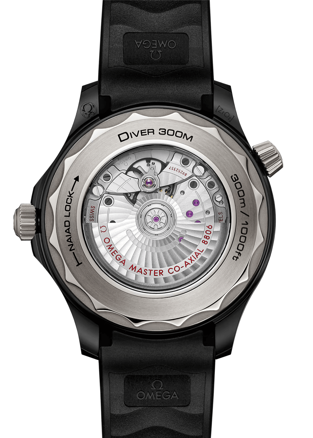 Die Uhr mit ihrem integrierten schwarzen Kautschukarmband mit schwarzer polierter und gebürsteter Keramikschliesse [ZrO2] wird von dem OMEGA Master Chronometer Kaliber 8806 angetrieben, das durch das Saphirglas des Gehäusebodens mit gewelltem Rand bewundert werden kann.