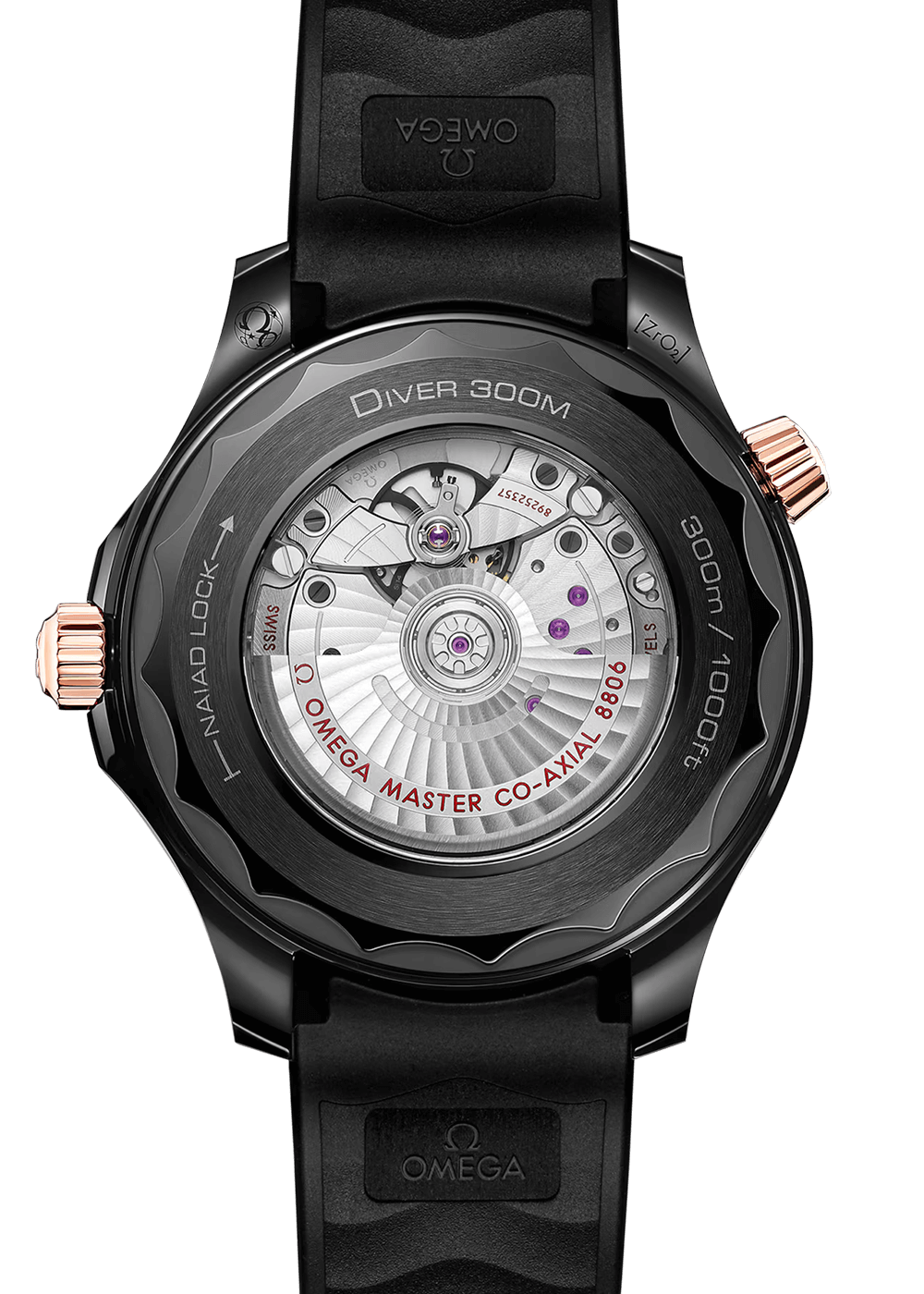 Der polierte und gebürstete, ausgerichtete Gehäuseboden mit Wellendekor verfügt über OMEGAs patentiertes NAIAD LOCK-System. Angetrieben wird die Uhr von OMEGAs Co-Axial Master Chronometer Kaliber 8806.