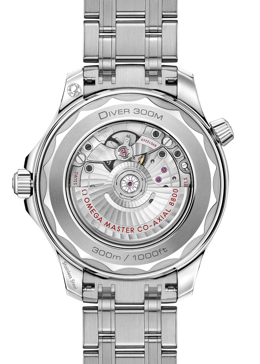 Angetrieben wird die Uhr mit verstellbarem Edelstahlarmband mit extra Tauchererweiterung vom OMEGA Master Chronometer-Kaliber 8800, das durch das Saphirglas des Gehäusebodens mit gewelltem Rand bewundert werden kann.