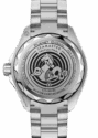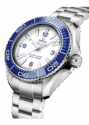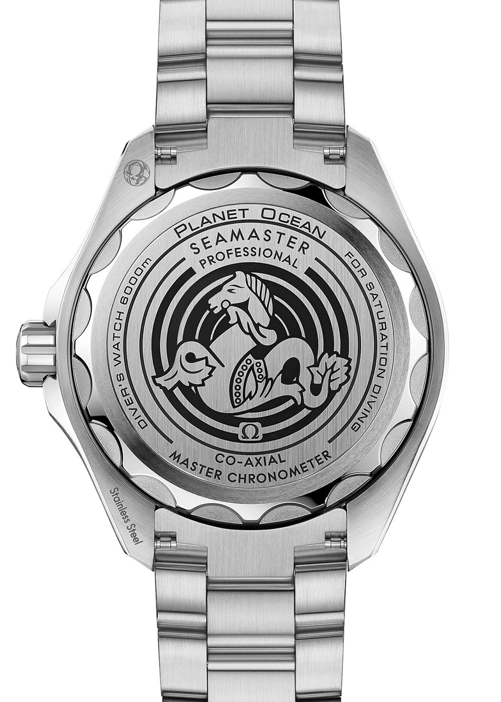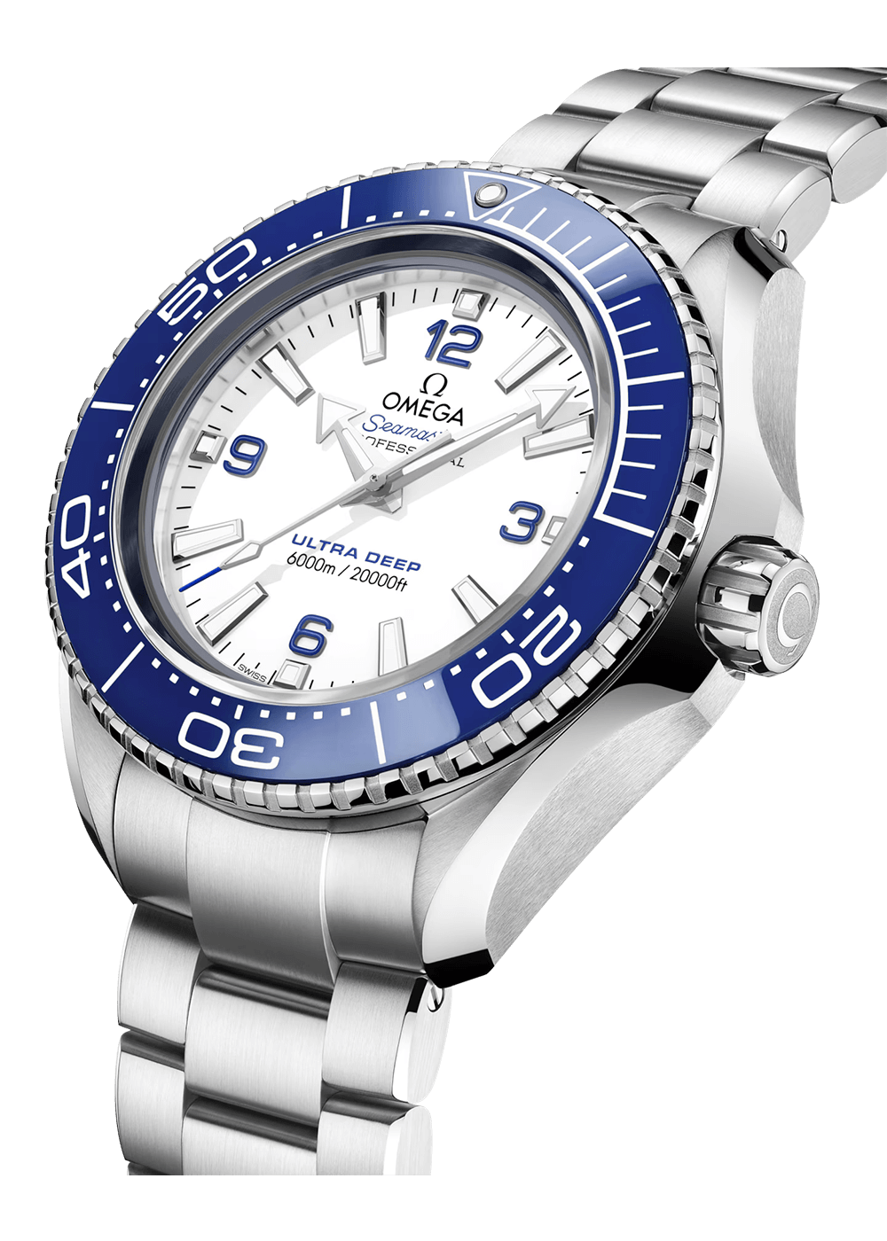 Dieses 45,5 mm grosse Modell aus robustem O-MEGASTEEL besitzt eine polierte blaue Keramiklünette mit einer Tauchskala aus weissem Email. Durch das hervorstehende, gewölbte Saphirglas ist ein weisses Zifferblatt mit vier arabischen Ziffern in Blau sowie Zeigern und Indizes aus 18 Karat Weissgold zu sehen, die mit weisser Super-LumiNova beschichtet sind.