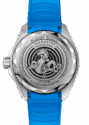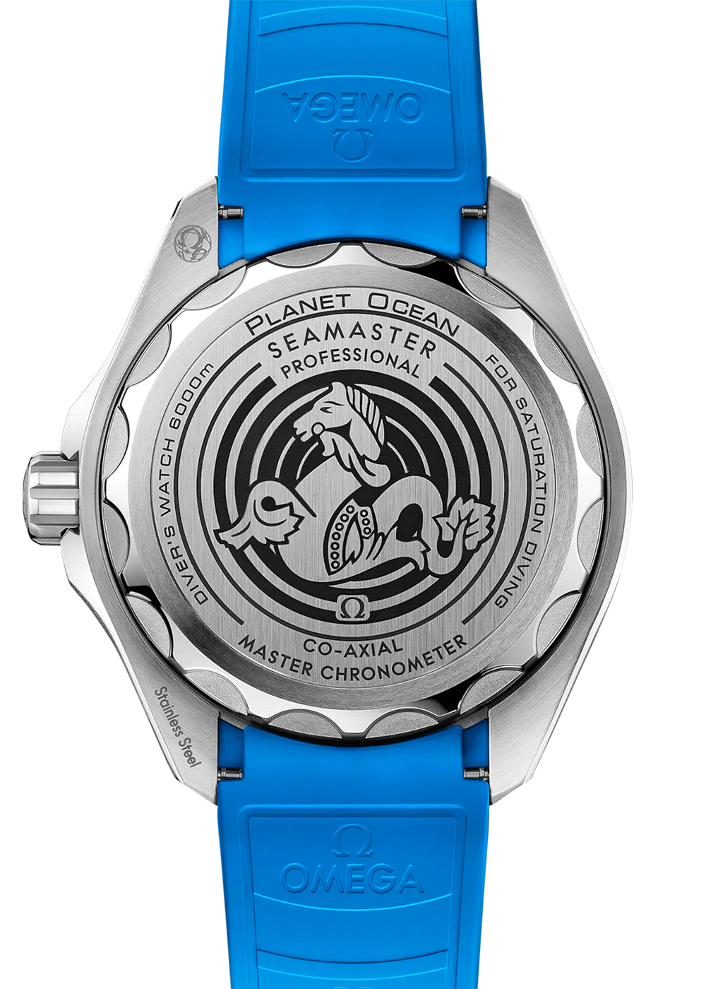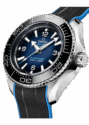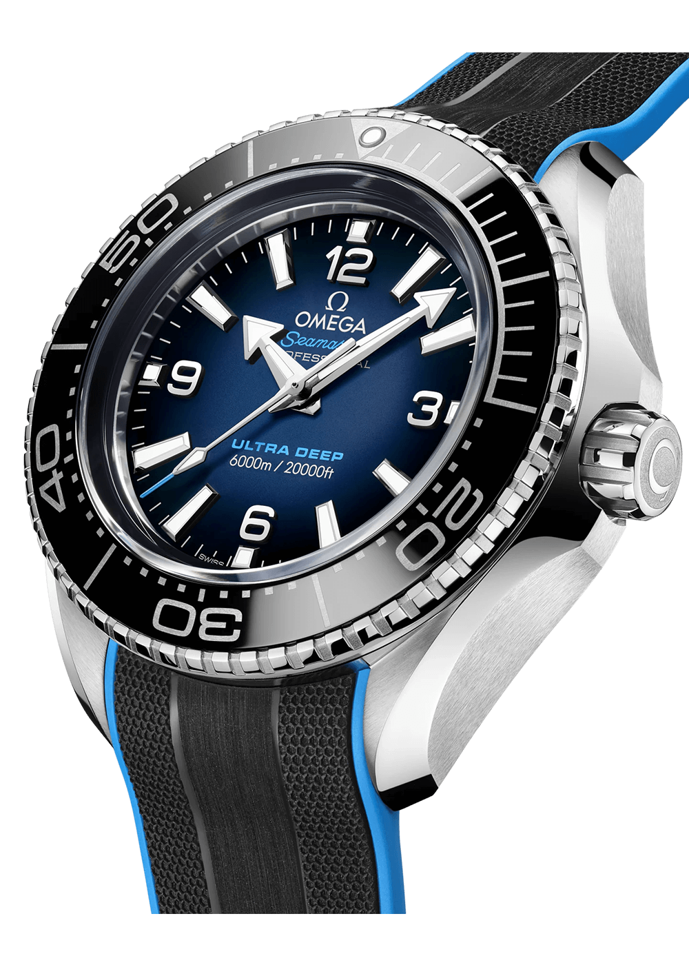 Dieses 45,5 mm grosse Modell aus robustem O-MEGASTEEL besitzt eine polierte schwarze Keramiklünette mit einer Tauchskala aus Liquidmetal™. Durch das hervorstehende, gewölbte Saphirglas ist ein lackiertes Zifferblatt mit einem Farbverlauf von Blau nach Schwarz sowie Zeigern und Indizes aus 18 Karat Weissgold zu sehen, die mit weisser Super-LumiNova beschichtet sind.