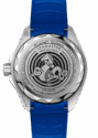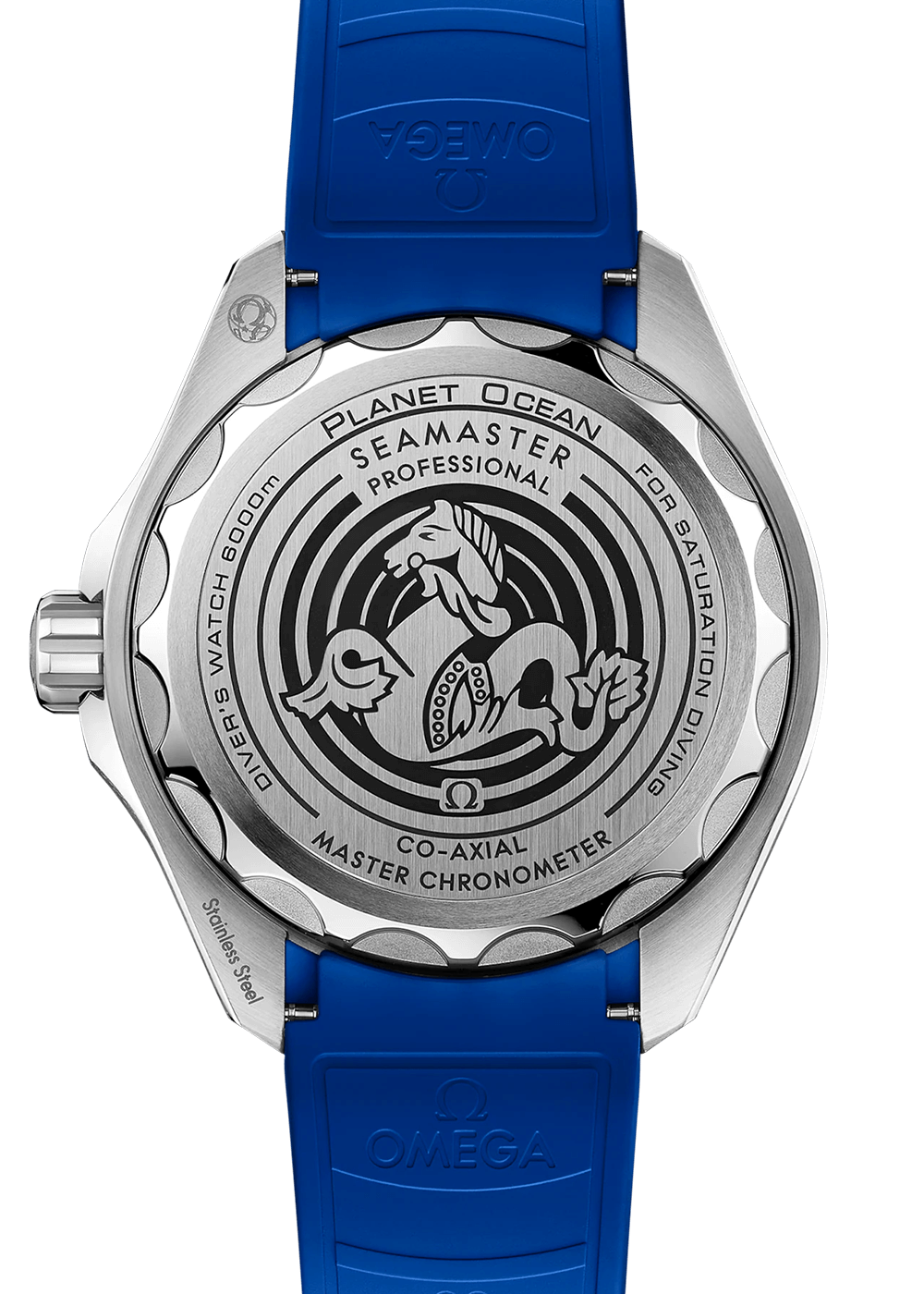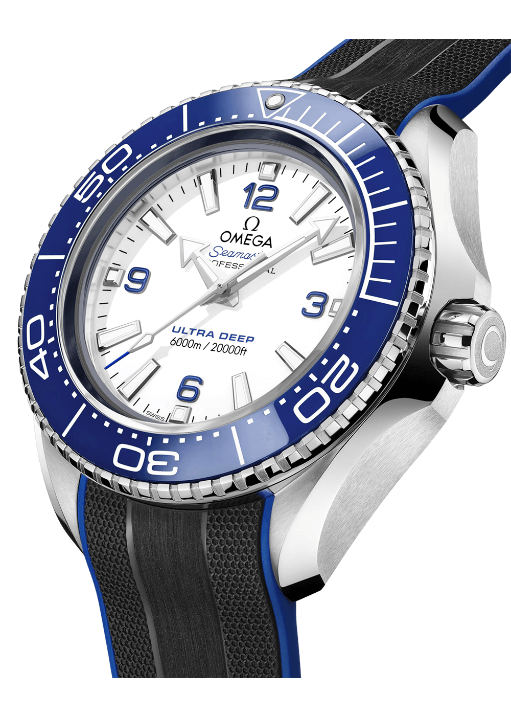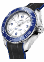 Dieses 45,5 mm grosse Modell aus robustem O-MEGASTEEL besitzt eine polierte blaue Keramiklünette mit einer Tauchskala aus weissem Email. Durch das hervorstehende, gewölbte Saphirglas ist ein weisses Zifferblatt mit vier arabischen Ziffern in Blau sowie Zeigern und Indizes aus 18 Karat Weissgold zu sehen, die mit weisser Super-LumiNova beschichtet sind.