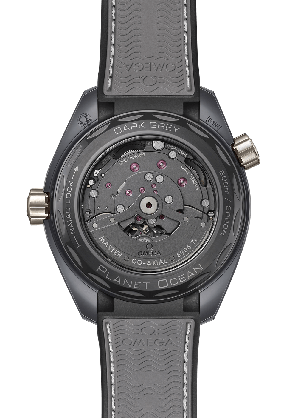 Die Uhr wird von einem schwarz-grauen strukturierten Kautschukarmband mit Schliesse aus Titan Grade 5 am Handgelenk gehalten und von dem Co-Axial Master Chronometer Kaliber 8906 Titanium angetrieben. Das einzigartige und ultraleichte Uhrwerk befindet sich hinter einem NAIAD LOCK-Gehäuseboden mit beidseitig entspiegeltem Saphirglas und Markierungen aus Chromnitrid.